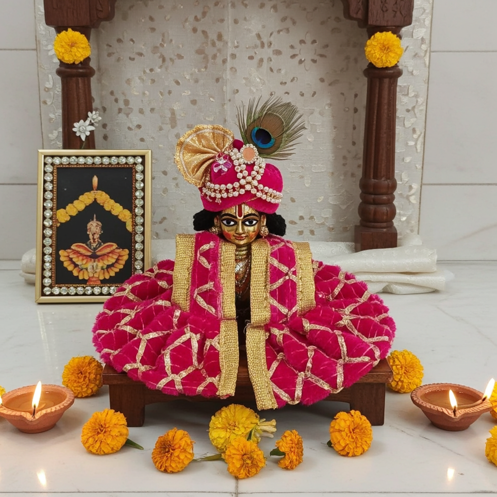 Laddu Gopal Winter Dress keep Thakur Ji warm and beautifully adorned during the winter season Designed with devotion and care, this poshak offers both comfort and elegance, ensuring your Gopal ji stays cozy while looking divine. The soft fabric helps protect from cold weather, making it ideal for daily seva as well as special pooja rituals.