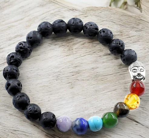 Crafted with natural lava stones and vibrant chakra crystals, each bead corresponds to one of the body’s seven energy centers. The lava stones, formed from volcanic rock, are known for their grounding properties and ability to absorb essential oils for aromatherapy benefits. Meanwhile, the seven colored beads represent the chakras—Root, Sacral, Solar Plexus, Heart, Throat, Third Eye, and Crown—offering holistic balance and emotional harmony.