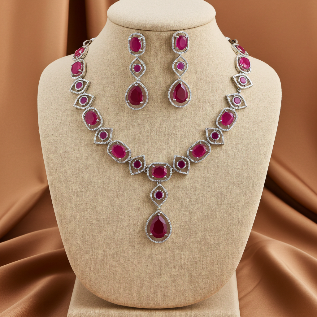 This radiant necklace features sparkling American Diamonds  set in a sleek silver-plated base. The craftsmanship highlights intricate detailing, ensuring every stone catches the light just right. Whether you’re stepping into a family celebration or dressing for your best friend’s wedding, this piece adds the right dose of sophistication and drama to your outfit.