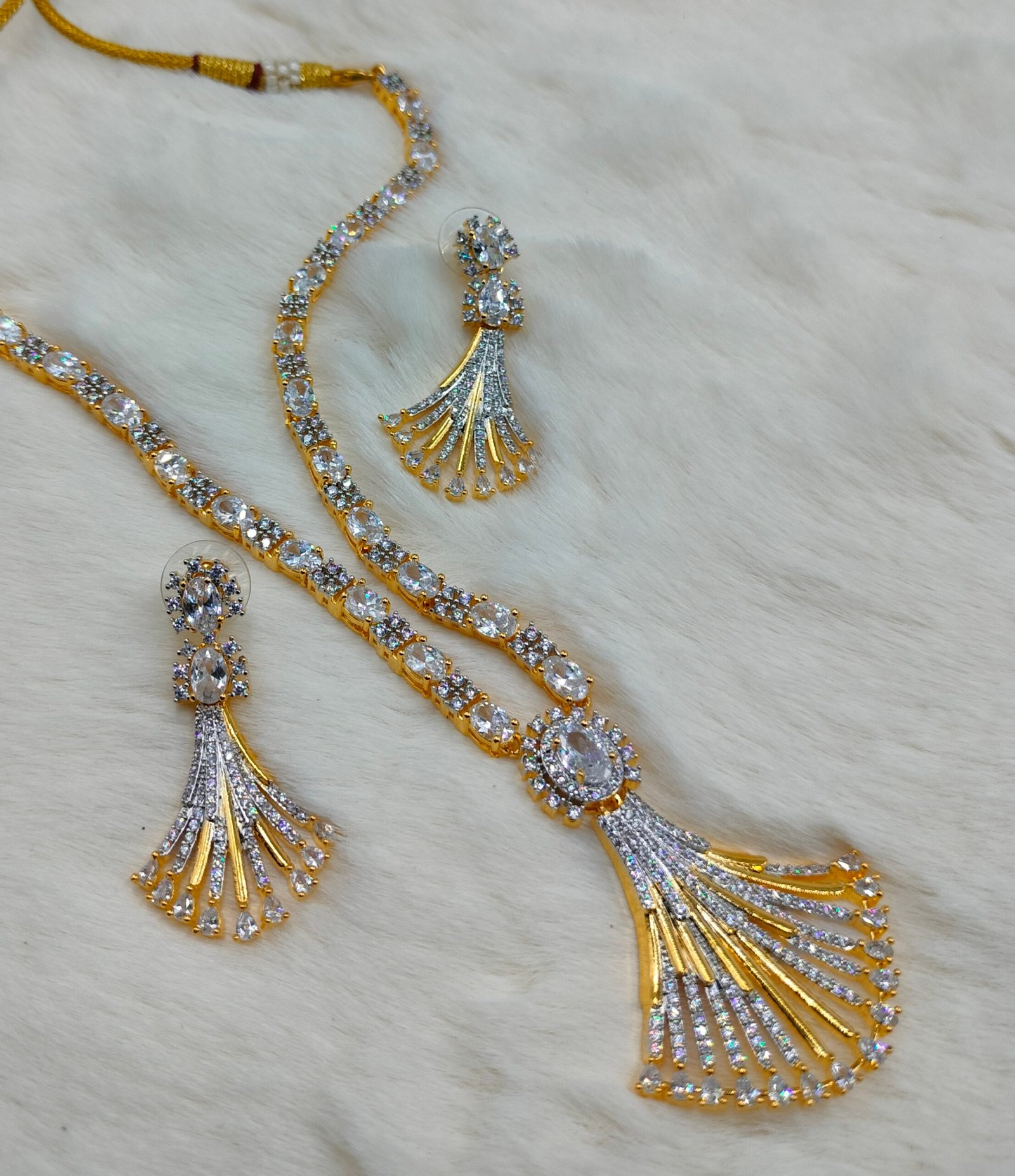 This sparkling necklace features high-quality American Diamonds placed with precision on a gold-polished base. The design curves gracefully around your neckline, offering a regal finish to your ensemble. Paired with beautifully coordinated earrings, the set becomes an instant showstopper. Its lightweight material ensures all-day comfort, while the adjustable hook lets you achieve the perfect fit effortlessly.