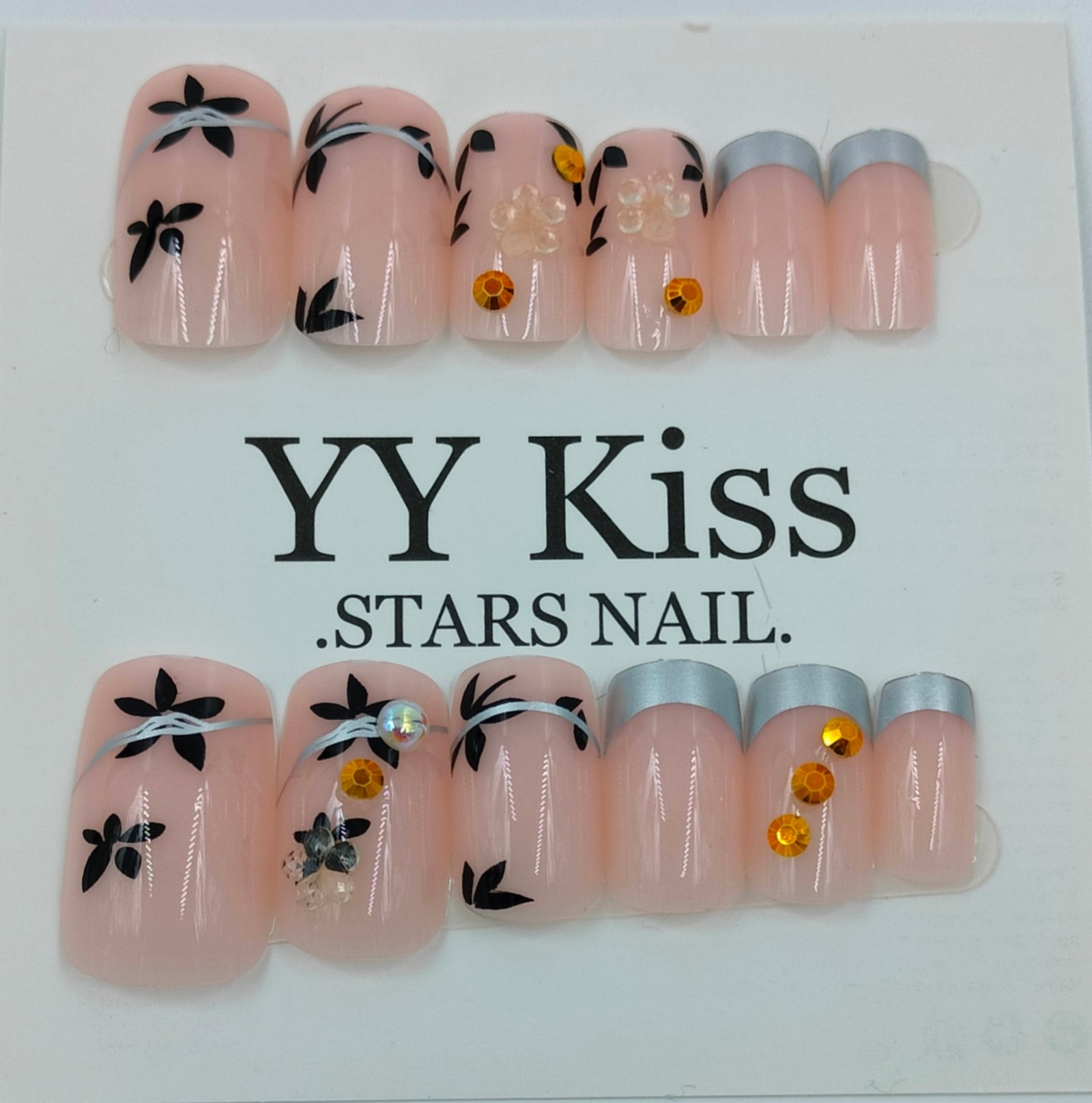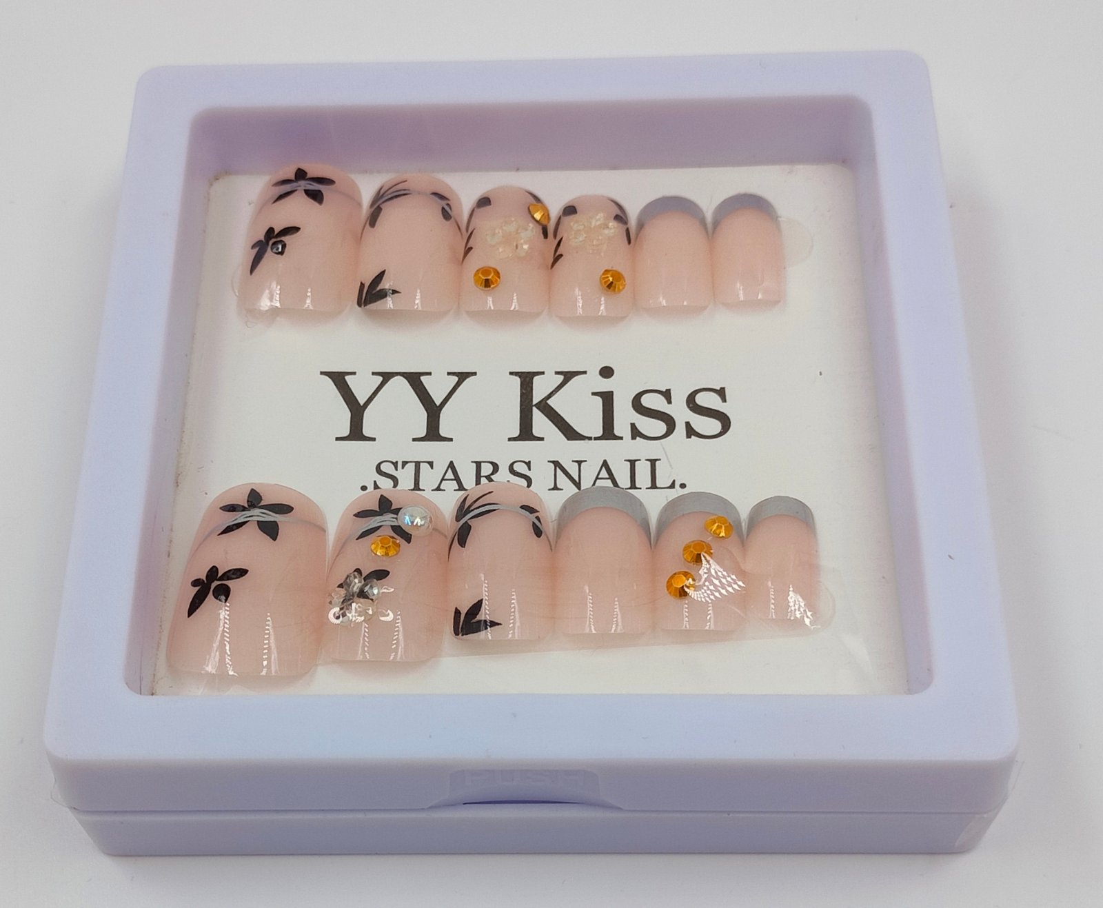 These press-on nails feature a soft matte grey base with delicate black floral detailing, creating a sophisticated and feminine look. The timeless floral pattern makes them versatile enough for weddings, parties, date nights, festive occasions, or simply elevating your everyday style.