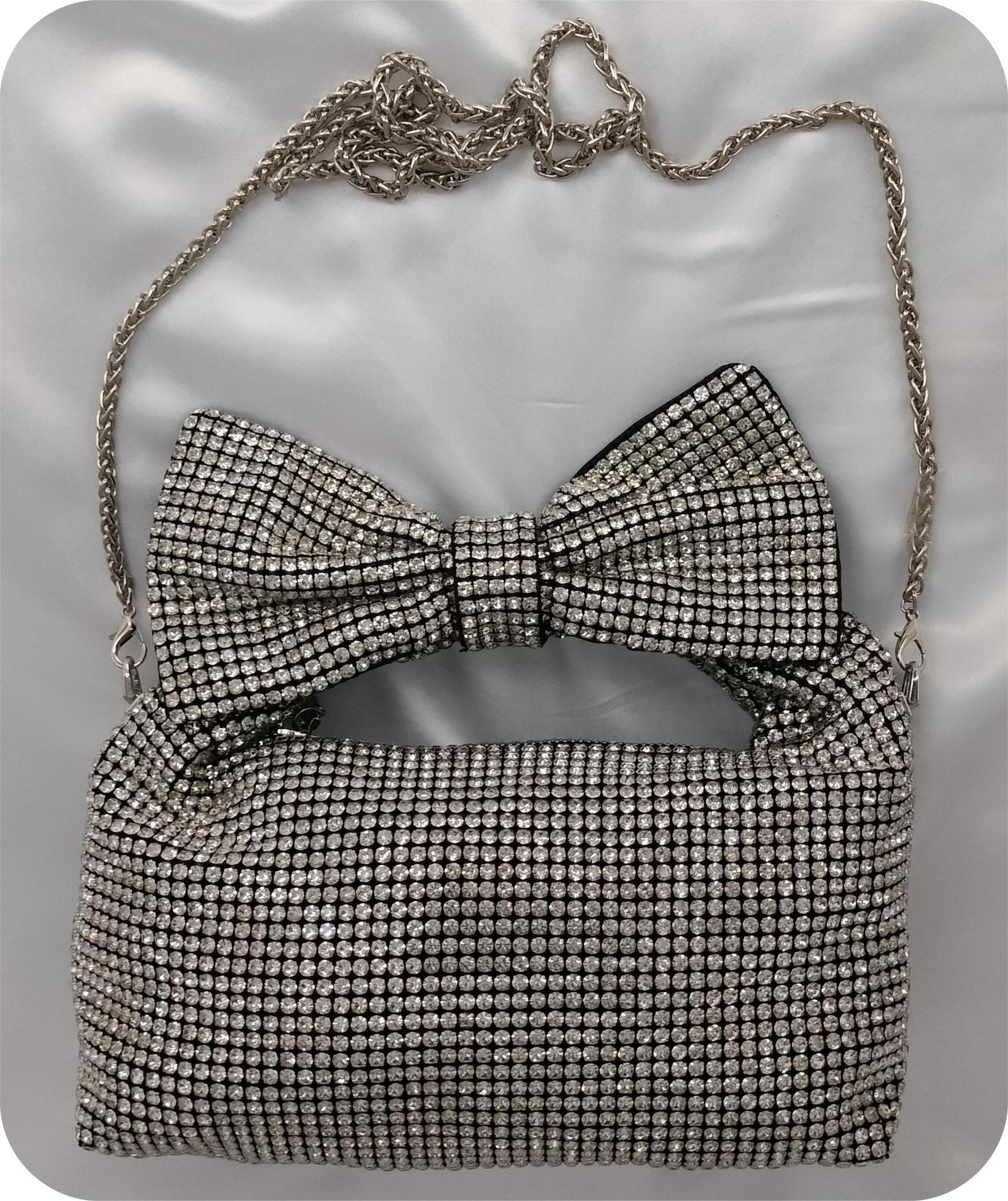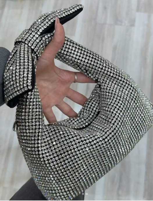 Crafted with shimmering black rhinestones, this glamorous clutch catches the light from every angle, ensuring you’re always in the spotlight. The classic black base gives it a rich and timeless appeal, while the intricate rhinestone embellishments add a hint of luxury.