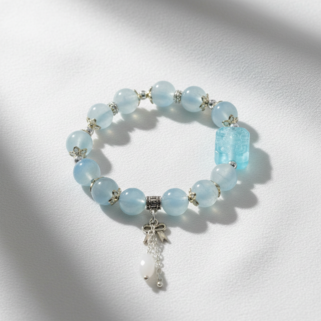 The bracelet features smooth sky-blue polished beads that radiate calmness and serenity. These beads are beautifully paired with golden and silver-toned spacers, which add a luxurious contrast and elevate the overall look. At its heart lies a carved centerpiece bead that makes the design stand out, giving it a unique character compared to ordinary beaded bracelets.