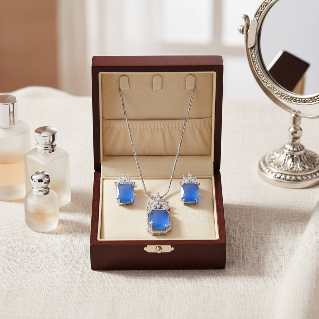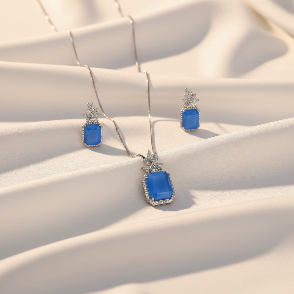 Bring royalty to your look with our Blue Crystal Pendant Set, a stunningly coordinated necklace and earring combination that adds elegance to every moment. This stylish fashion jewellery set highlights a striking blue gemstone centerpiece, complemented by dazzling white stones and glamorous silver plating. Therefore, whether it’s a festive occasion or a glamorous evening party, this set guarantees that you shine with unmatched sophistication.