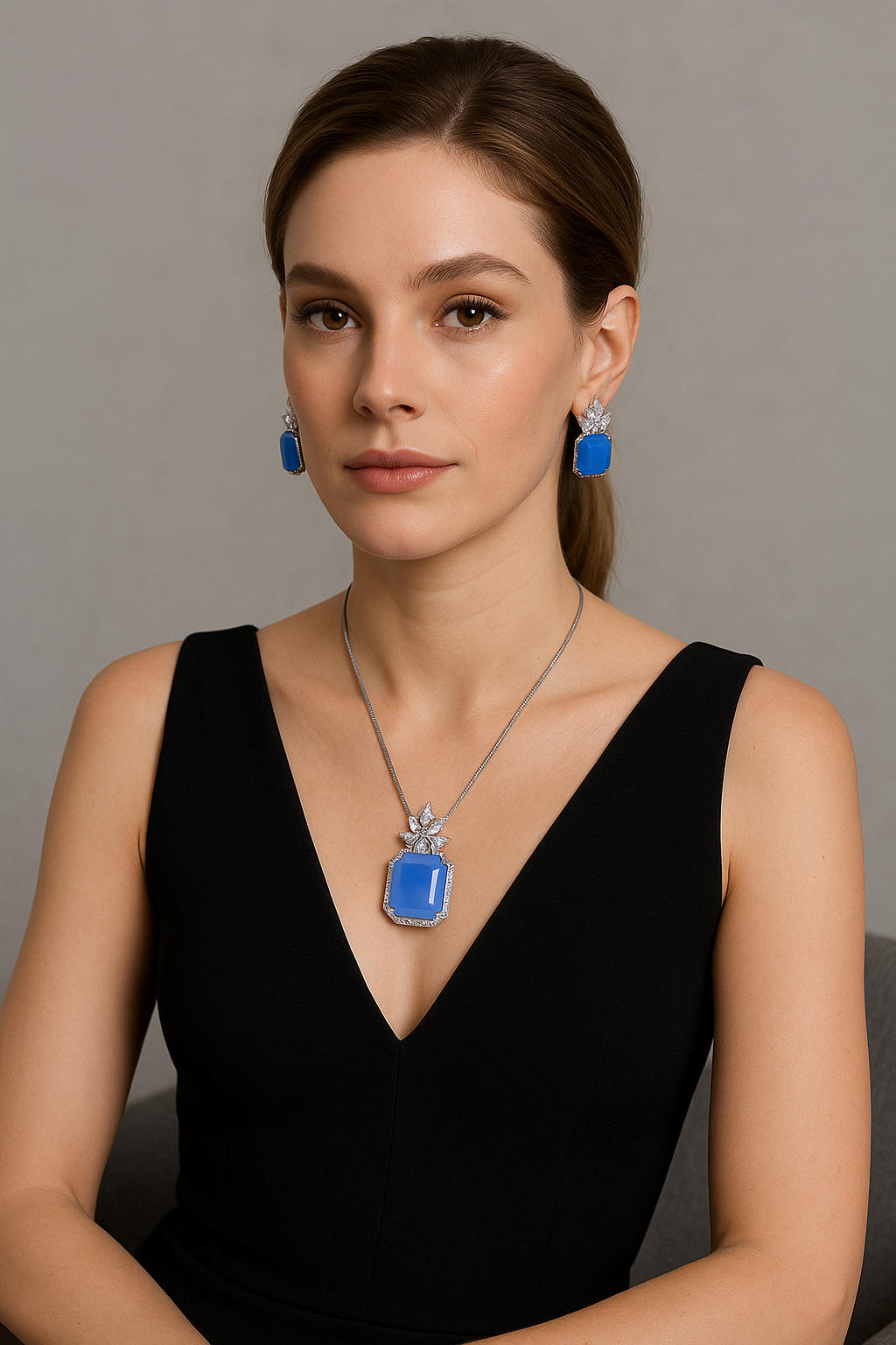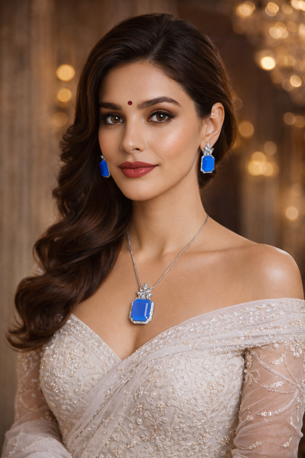 This universal pendant set is ideal for weddings, engagements, cocktail parties, and festive gifting. In addition, it pairs beautifully with both western and traditional attire. For example, you can style it with a saree, gown, or even a solid-colored blouse to highlight the deep blue tone. Hence, its versatility and charm make it a perfect gift for birthdays, anniversaries, or festive surprises.