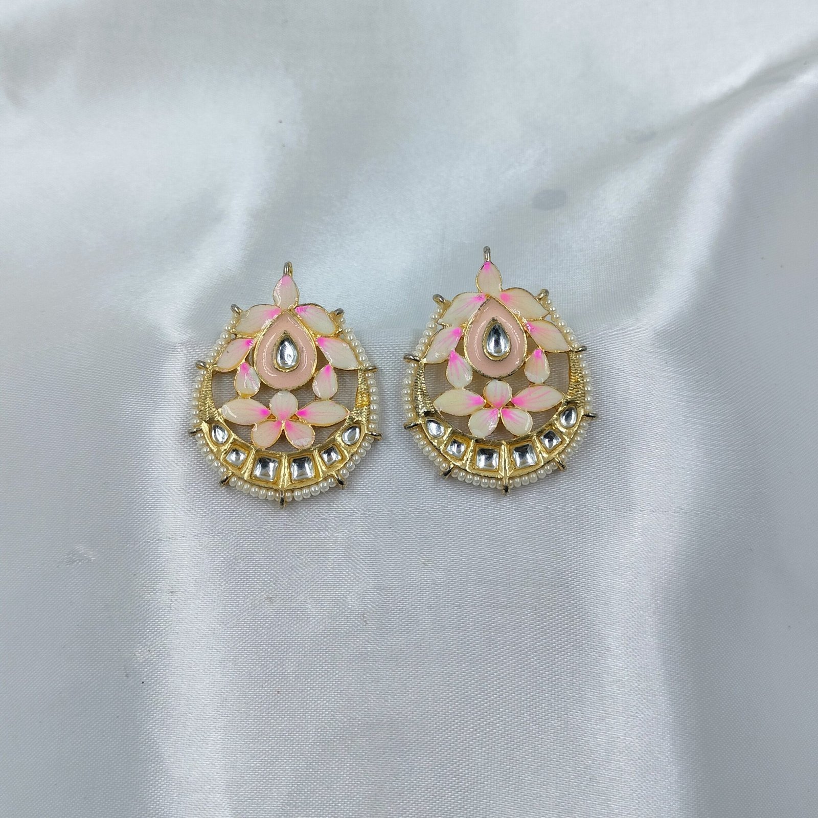 At the center of each earring lies a radiant teardrop-shaped Kundan stone, celebrated for its regal sparkle. Surrounding it are mirror-polished stones that shimmer with every movement, while delicate pearl beads create a refined finishing touch. The blush pink and ivory enamel is hand-painted in a lotus-inspired floral design, making these earrings a true work of art.