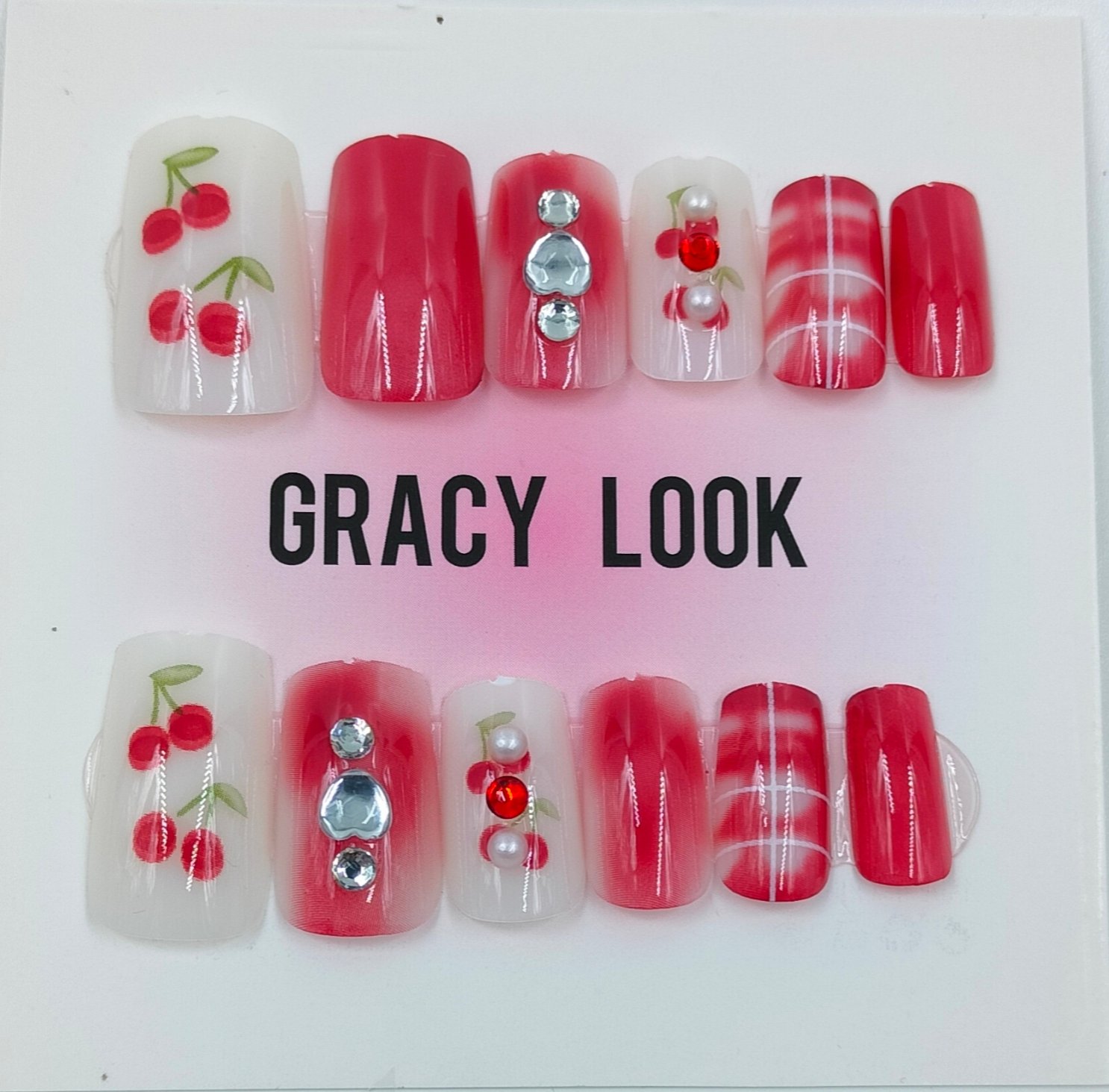 No salon time? No worries! With Cherry Charm Press-On Nails from www.radiantjewels.store