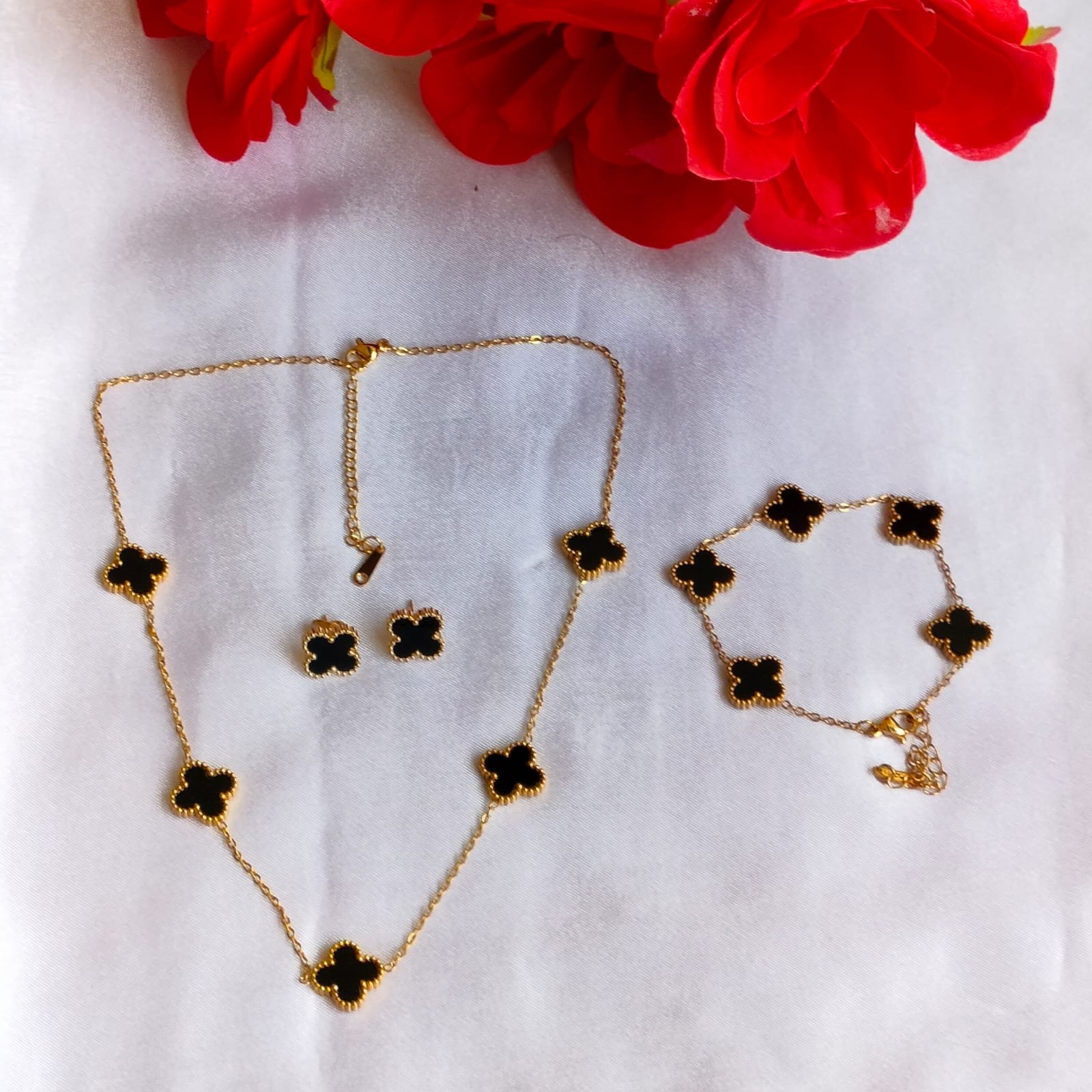 Step into elegance with our Clover Jewelry Set, a 3-piece collection that includes a graceful necklace, a matching bracelet, and a pair of classic earrings. Designed to blend timeless charm with everyday simplicity, this set is the perfect choice for women who appreciate refined beauty. Whether you’re heading to a festive event or enhancing your daily look, this jewelry set adds a touch of sophistication to any outfit.