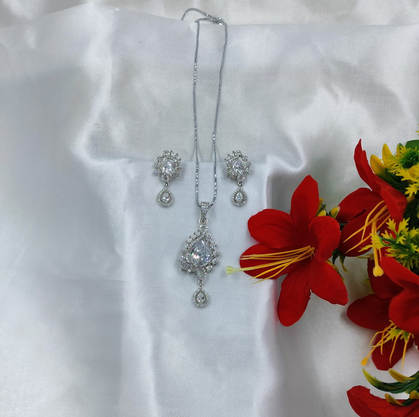 Diamond-like stones surround the crystal, enhancing its charm without overpowering the delicate design. The matching earrings follow the same teardrop style, giving you a complete and polished appearance. Whether you’re dressing for a wedding, party, or festive event, this set is a perfect match.
