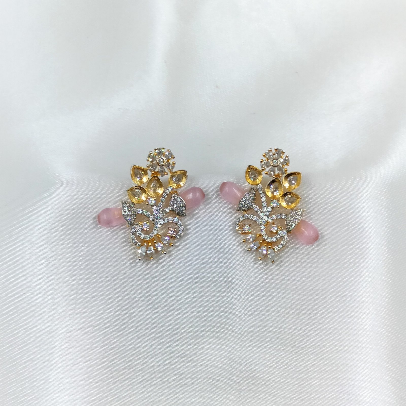 Each pair is crafted with care to ensure a lightweight and comfortable experience. The golden-toned floral pattern dazzles with intricate CZ detailing, while the blush pink beads lend a gentle, romantic appeal. Despite their petite size, these studs pack in plenty of glamour. They rest easily on the ears, making them ideal for all-day wear, even during long celebrations.
