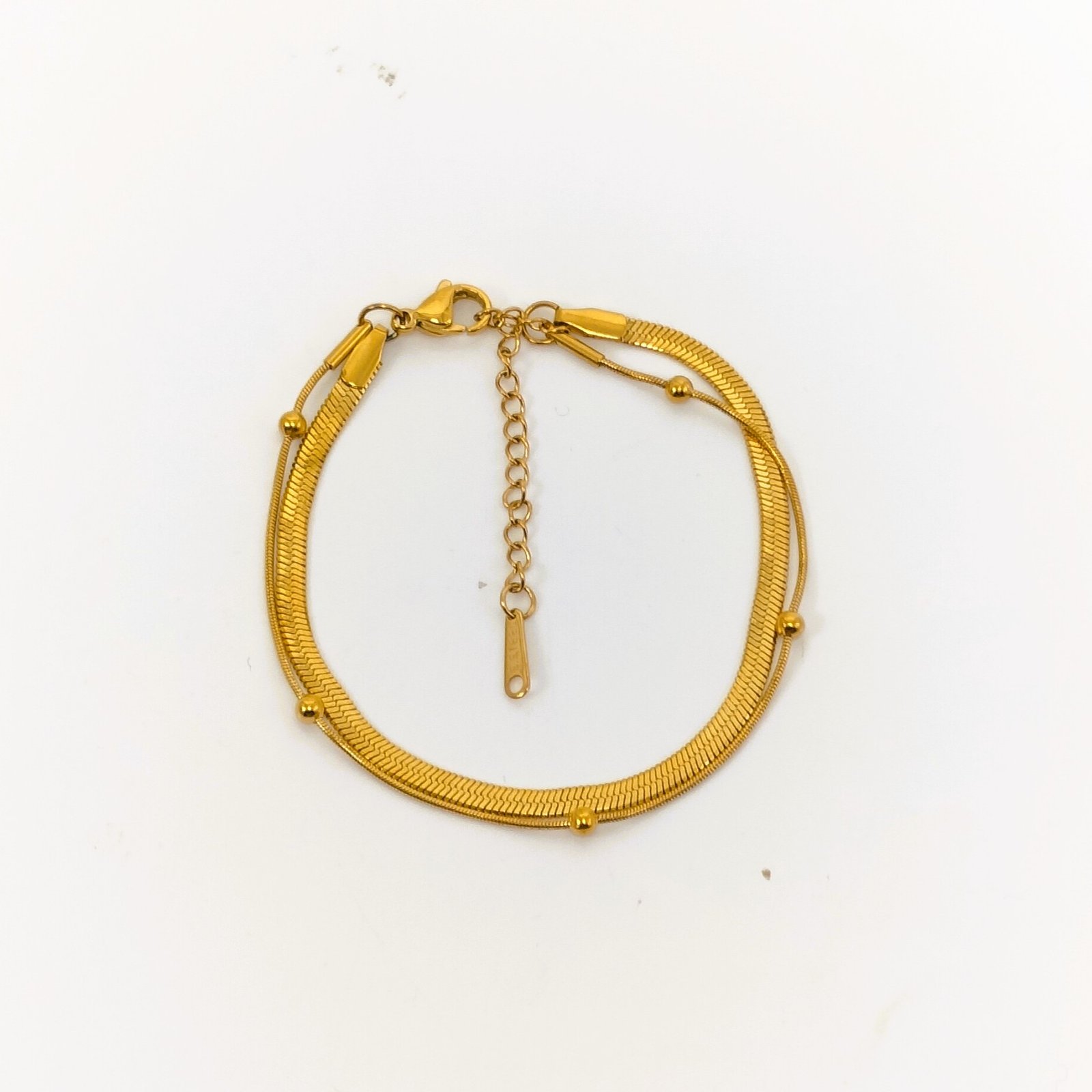 Crafted in a refined gold-tone finish, each chain lies smoothly on the wrist and moves with a gentle flow, catching light in a soft, flattering way. Unlike chunky or oversized jewellery, the double-chain design offers a feminine, delicate presence while still feeling modern and fashion-forward. The anti-tarnish plating ensures long-lasting shine, so you can enjoy its beauty without constant maintenance.