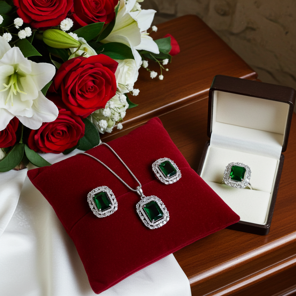 Add a touch of timeless elegance to your jewelry box with our Elegant Emerald Stone Jewelry Set. This stunning set showcases vibrant, square-cut emerald green stones, framed by shimmering white stones that highlight their rich color. The regal combination of green and white gives it a luxurious, high-end look that instantly elevates your style.