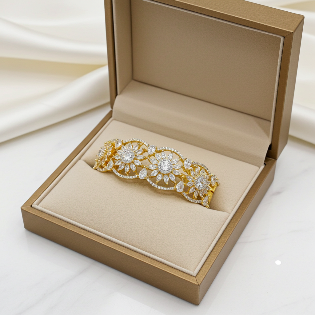 Elegant Floral Crystal Bracelet features a dainty floral pattern, each flower embedded with high-shine crystals that catch light from every angle. The design strikes a perfect balance between subtle and striking, making it suitable for both everyday elegance and festive occasions.