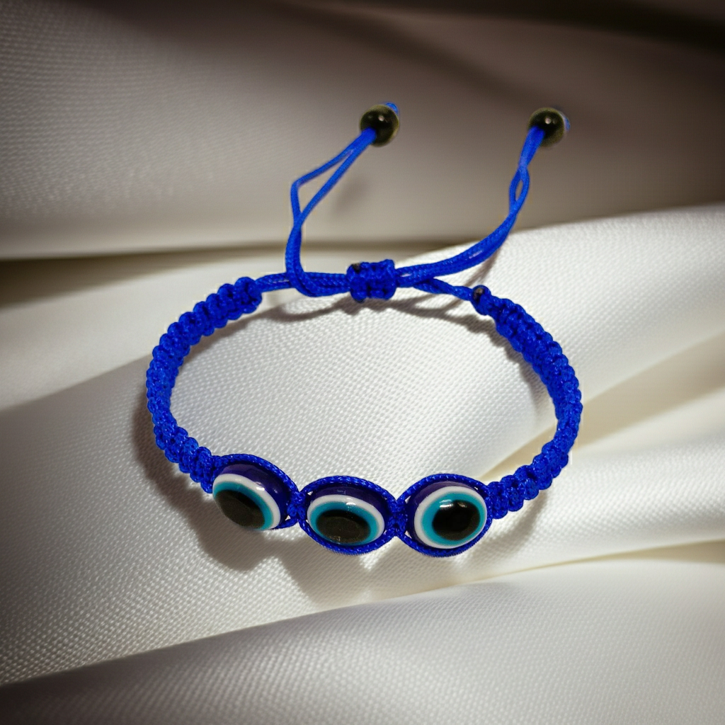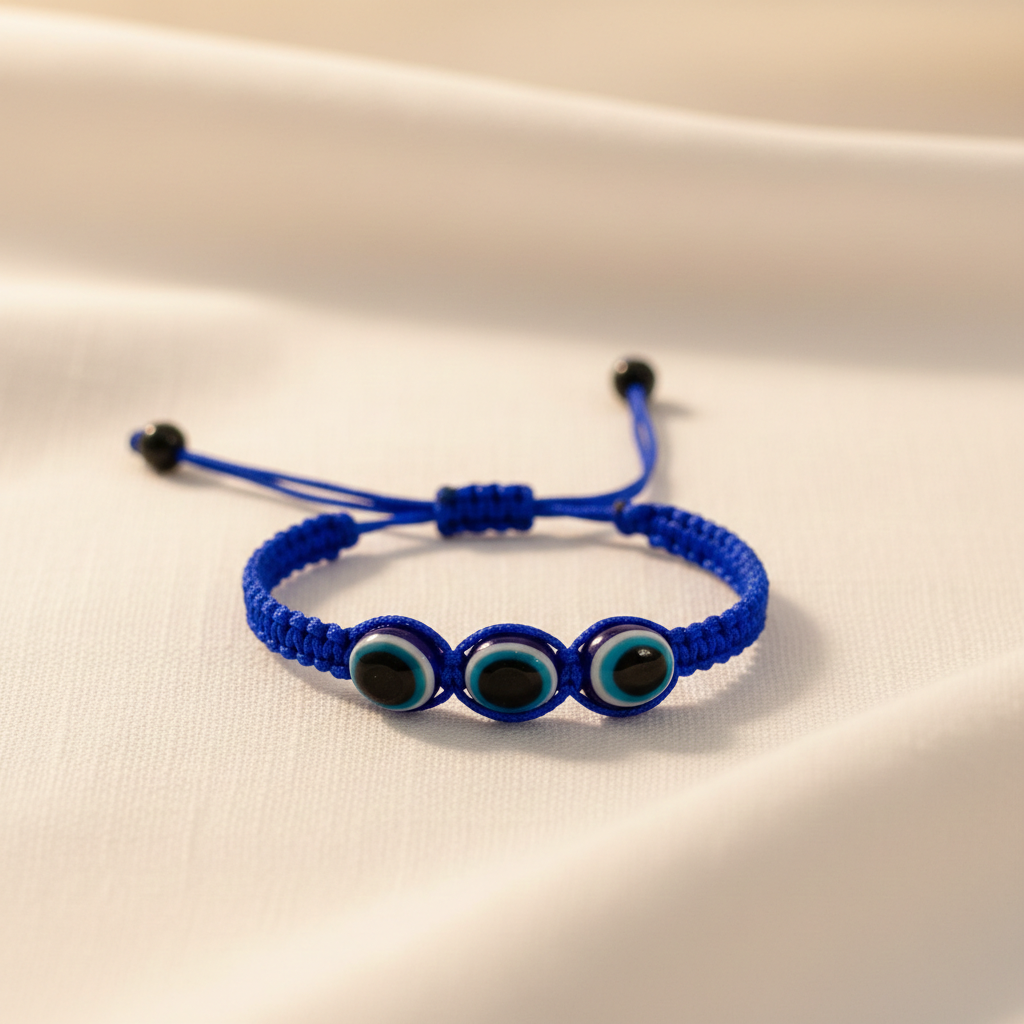 The Evil Eye Thread Bracelet from Radiant Jewels Store blends fashion with belief. It’s designed for people who love meaning in their accessories. This bracelet uses three Evil Eye stones tied neatly on a soft blue thread. Each stone helps block negativity and invites good luck.