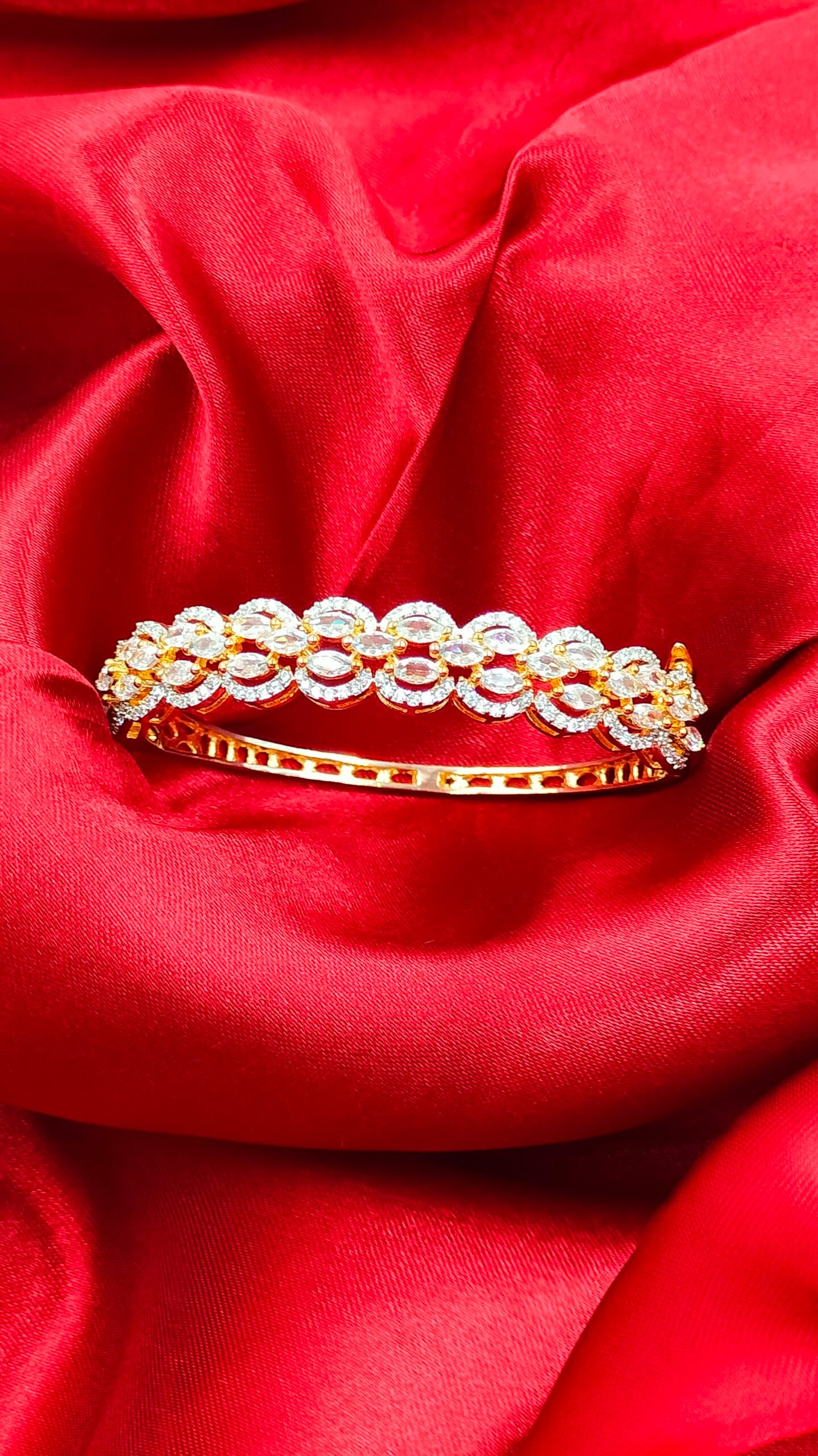 The regal gold finish pairs effortlessly with Indian bridal wear—including lehengas, sarees, shararas—as well as Indo-western gowns and party dresses. Lightweight and comfortable, this designer bracelet is ideal for all-day wear during celebrations like Diwali, Karva Chauth, Mehendi, and Sangeet nights.