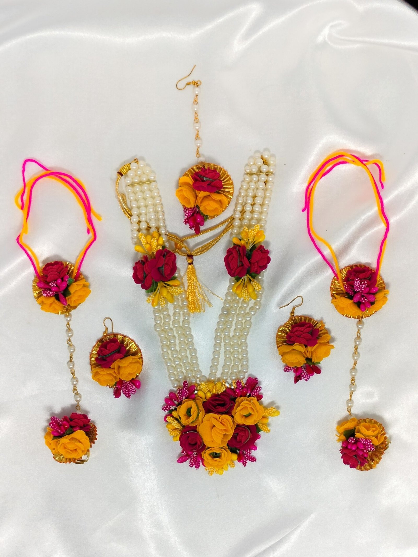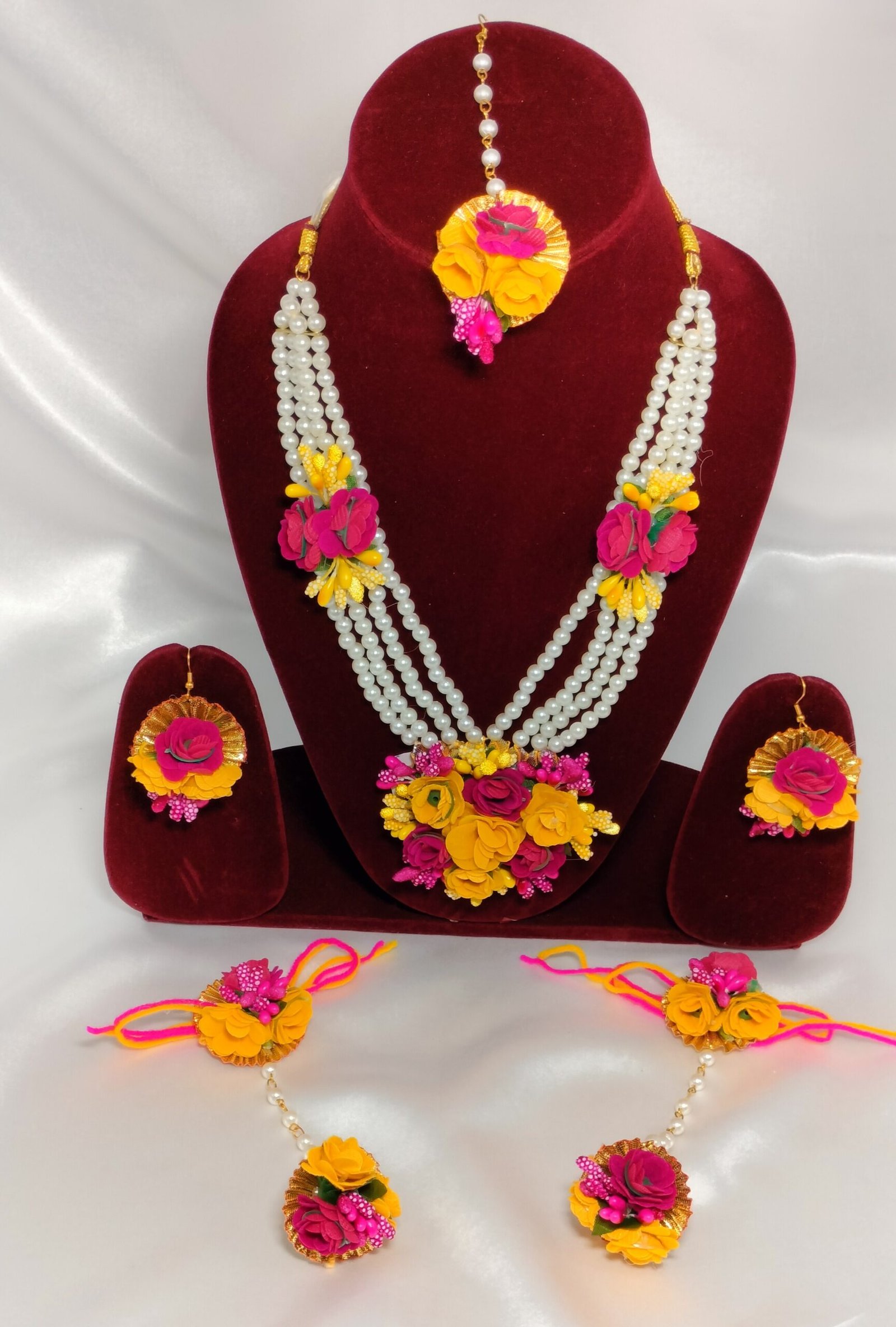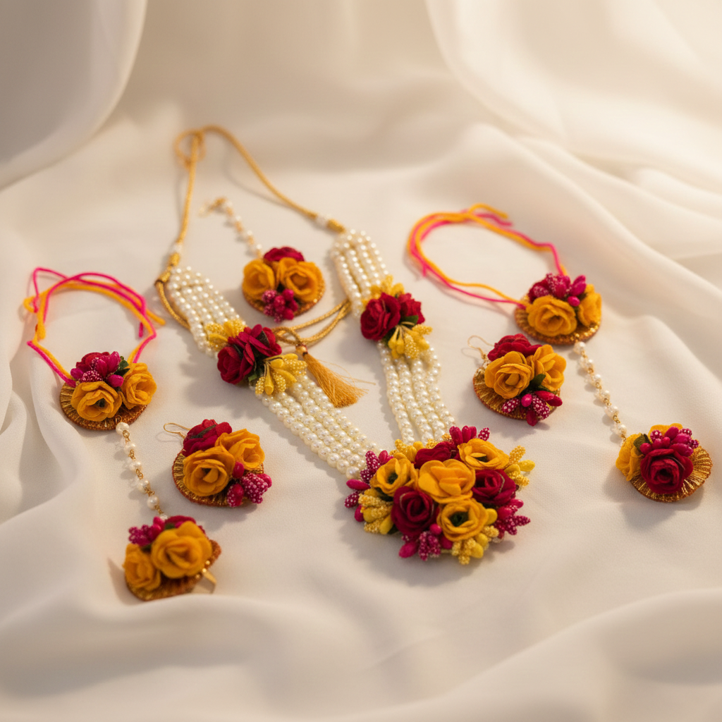 At Radiant Jewels Store, we believe every detail matters. Our designers focus on fine craftsmanship, ensuring each piece of Floral Jewellery for Haldi offers both durability and visual appeal. Unlike real flower sets that wilt quickly, these imitation floral pieces retain their beauty from morning rituals to evening celebrations. They are elegant, affordable, and reusable — a perfect balance of luxury and practicality.