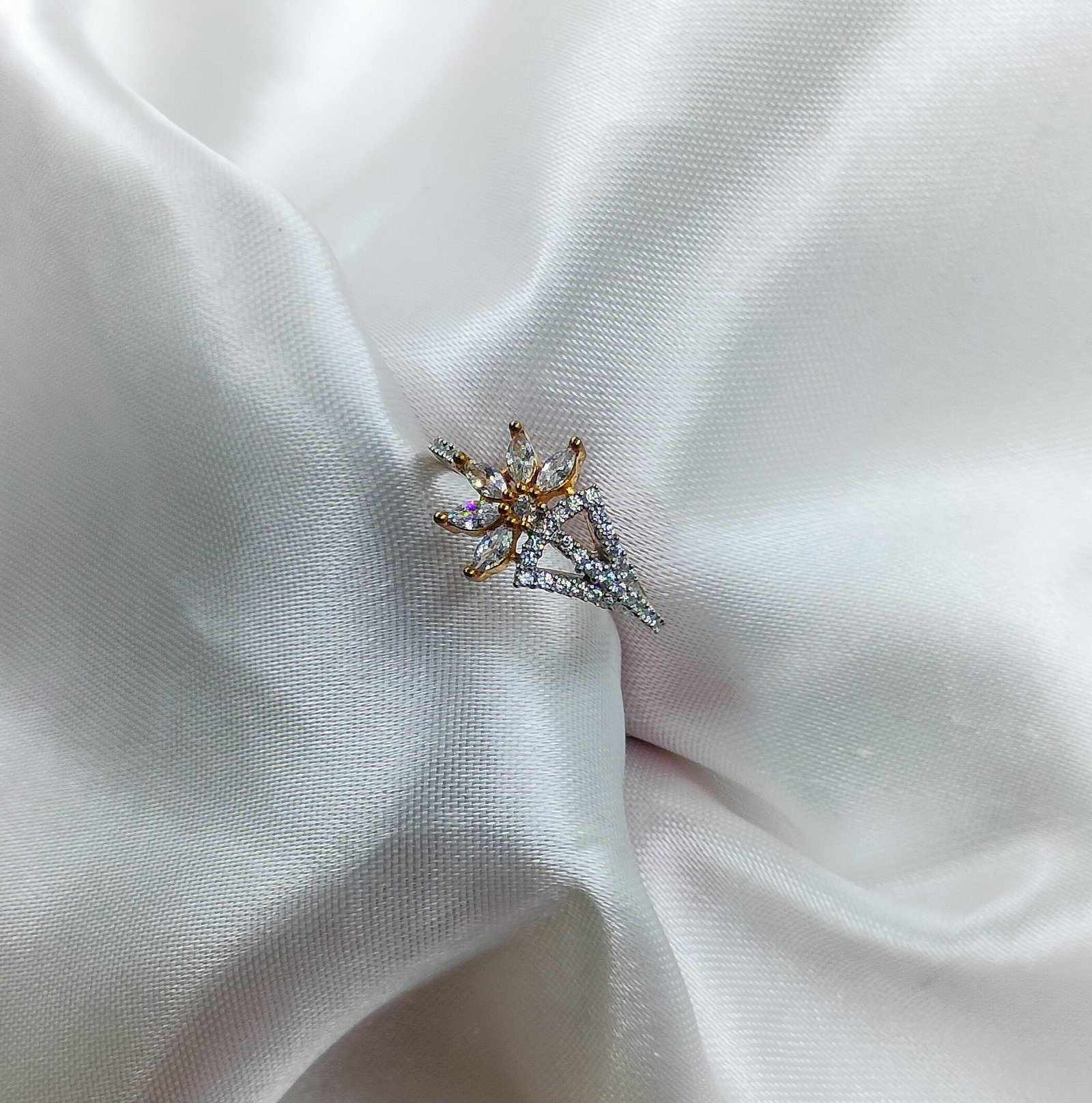 Add a touch of timeless charm to your look with our Floral Marquise AD Ring. This gold-plated masterpiece features a stunning floral pattern crafted from marquise-cut American Diamonds. Each petal sparkles brightly, making your hand shine with elegance.