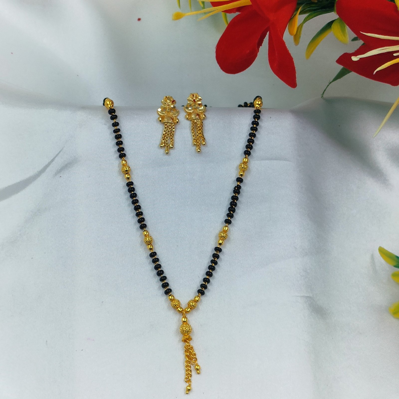 The mangalsutra features high-quality gold plating that ensures long-lasting shine. In addition, skilled artisans have crafted each bead and pendant with precision. The earrings perfectly match the design, thus creating a complete and coordinated look.