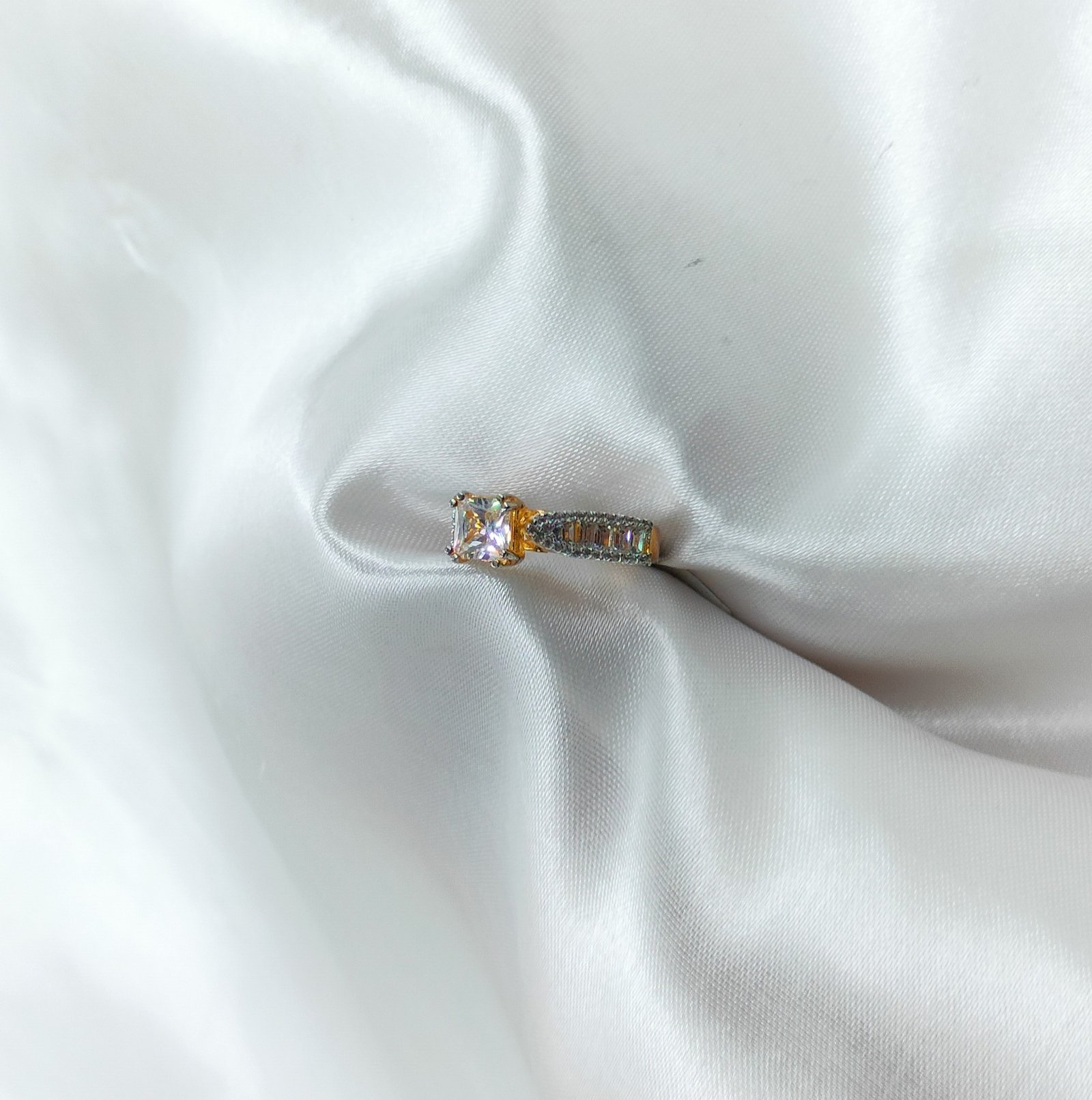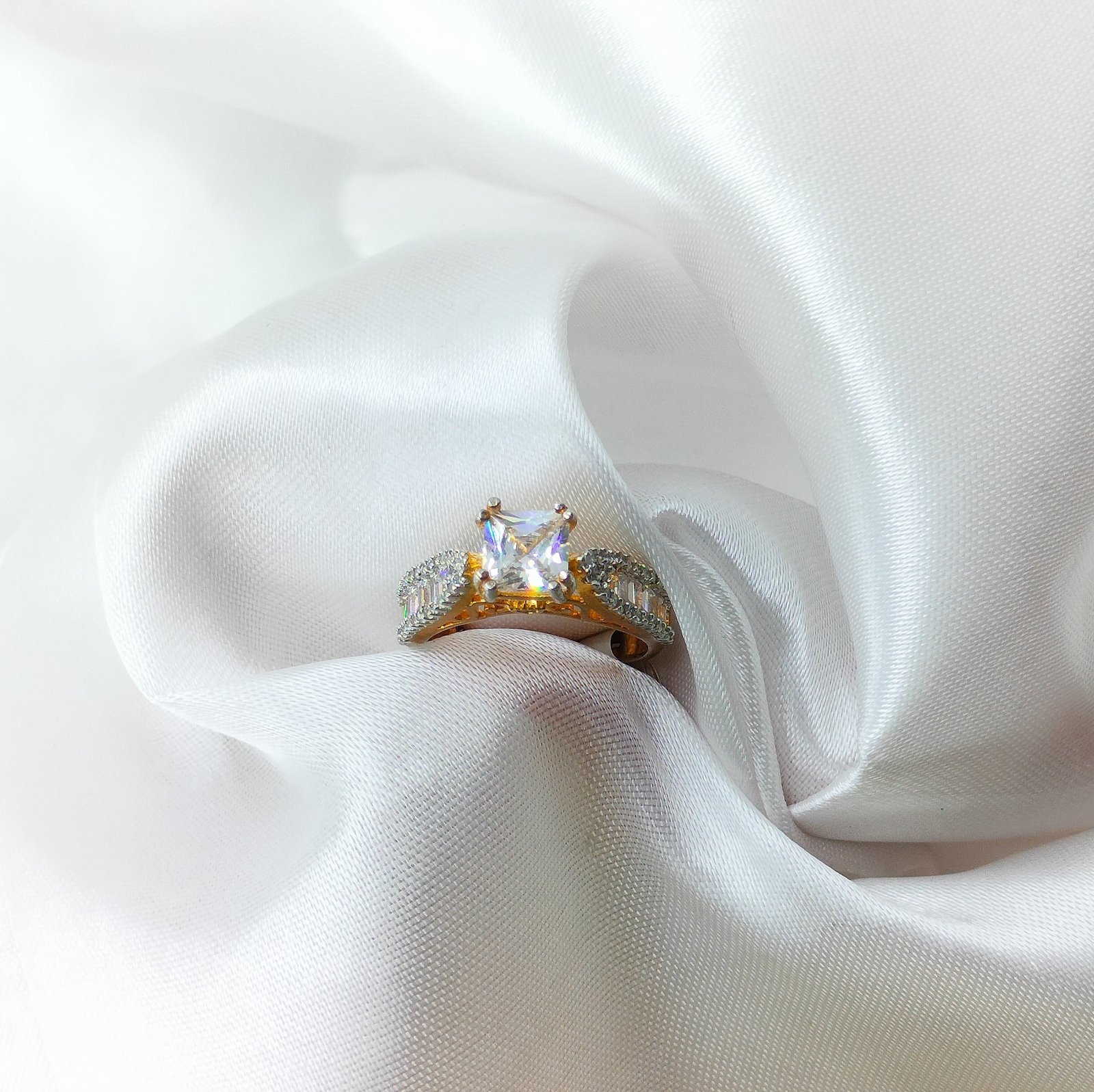 Indulge in timeless sophistication with our Princess-Cut AD Ring, a radiant piece that blends classic elegance with a modern edge. This striking gold-plated ring features a precisely cut princess-shaped American diamond (AD) at its center, surrounded by dazzling accents for an eye-catching sparkle.