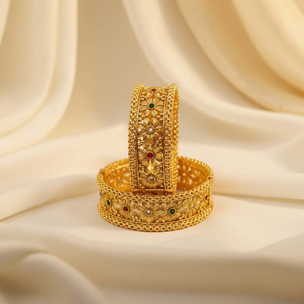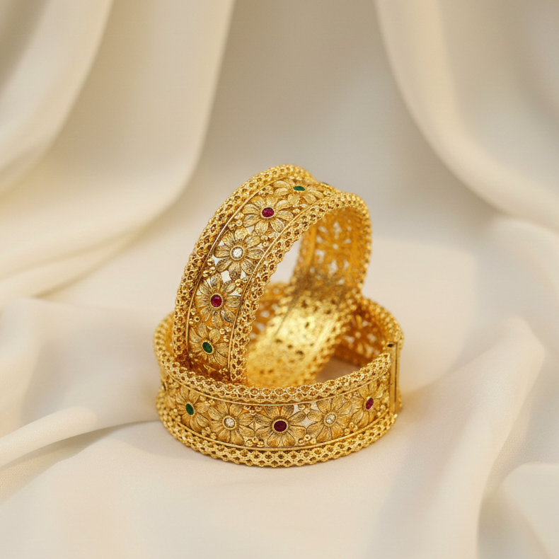 Designed for versatility, these bangles are ideal for weddings, festive celebrations, and cultural gatherings. The intricate floral motif adds a touch of classic beauty, while the shimmering stones catch the light beautifully, ensuring you stand out on every occasion. Whether paired with a saree, lehenga, or salwar suit, these bangles bring a regal charm to your ensemble.