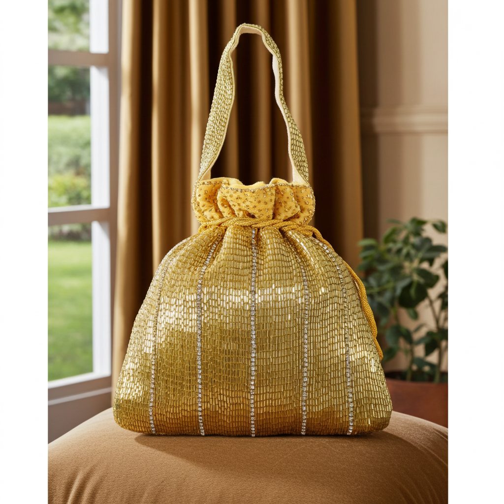 Whether you’re a bride, wedding guest, or festive fashionista, this Golden Katdana Potli Bag brings the ideal blend of function and flair.