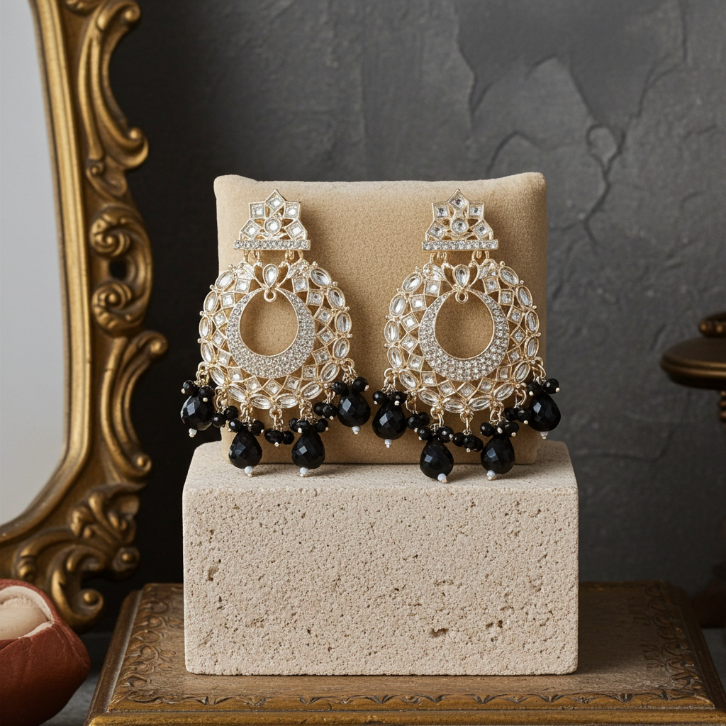 Product Name: Golden Kundan Earrings with Black Pearl Drops