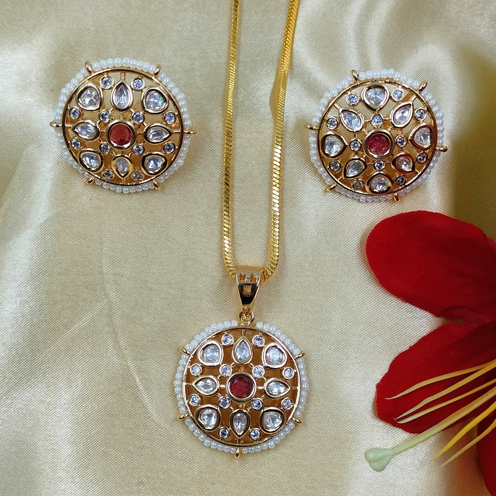 The centerpiece features a floral-inspired Kundan design, meticulously arranged to reflect regal Indian aesthetics. At the base, a shimmering faux pearl adds a soft, graceful finish, enhancing the pendant’s ethnic appeal. Whether you’re dressing up for a wedding, puja, or festive family gathering, this pendant set offers just the right amount of sparkle and sophistication.