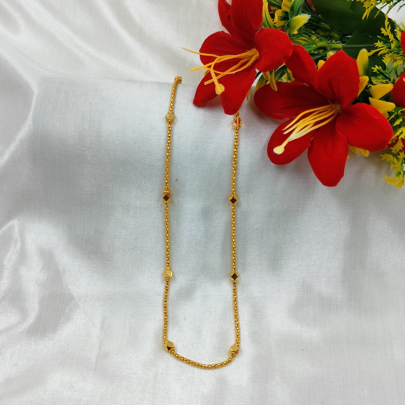 This chain is tailored for women who appreciate a clean and classic aesthetic. Moreover, its lightweight construction and smooth golden loops make it comfortable for all-day wear. The design is versatile enough to pair with a indian wear or even Western wear. In addition, it works beautifully with bridal imitation jewellery or other artificial jewellery pieces for a subtle yet stylish look.