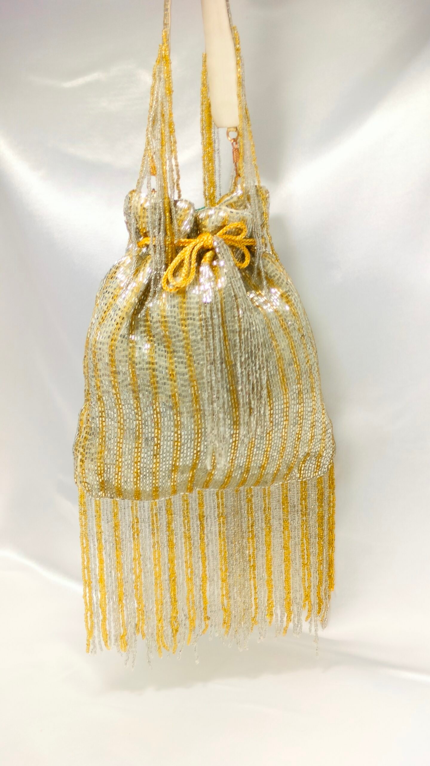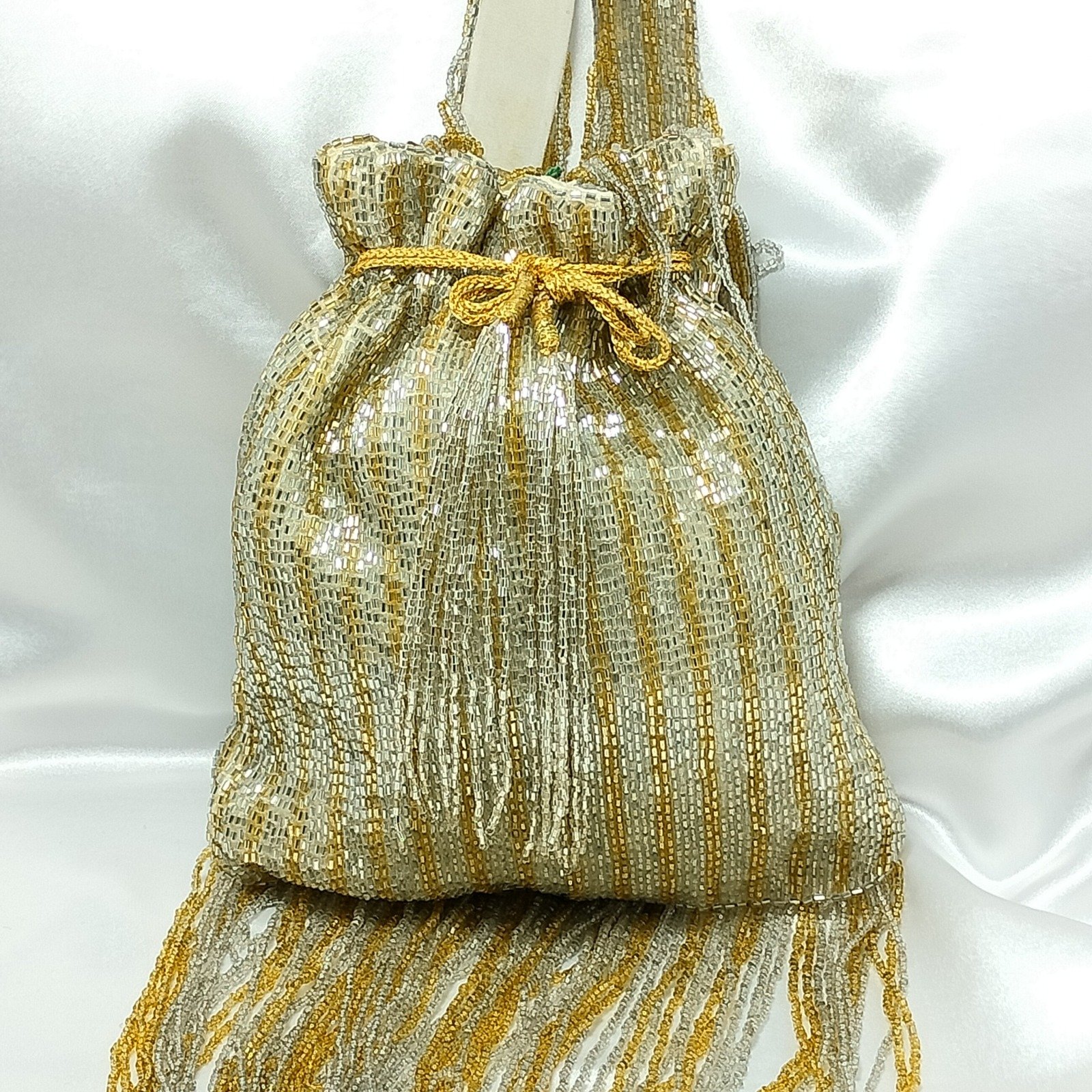 If you’re seeking a fusion of tradition and shimmer, look no further than the Golden Silver Katdana Potli Bag. This dual-tone festive accessory is designed for women who love to pair their outfits with timeless elegance and bold sparkle.