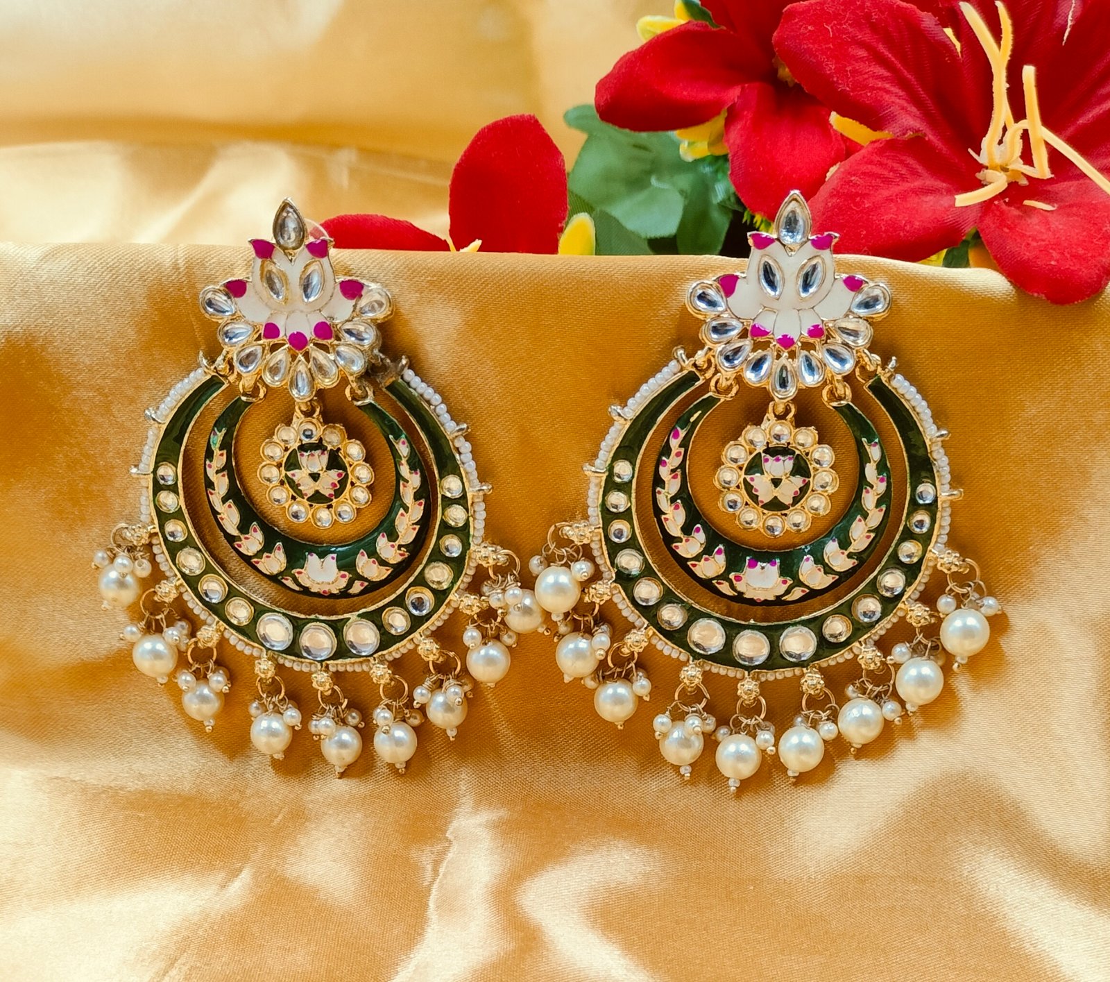 Add instant charm to your ethnic look with our Green Chandbali with Pearl Drops. These stunning earrings combine traditional artistry with a refreshing pop of green and the elegance of pearls.