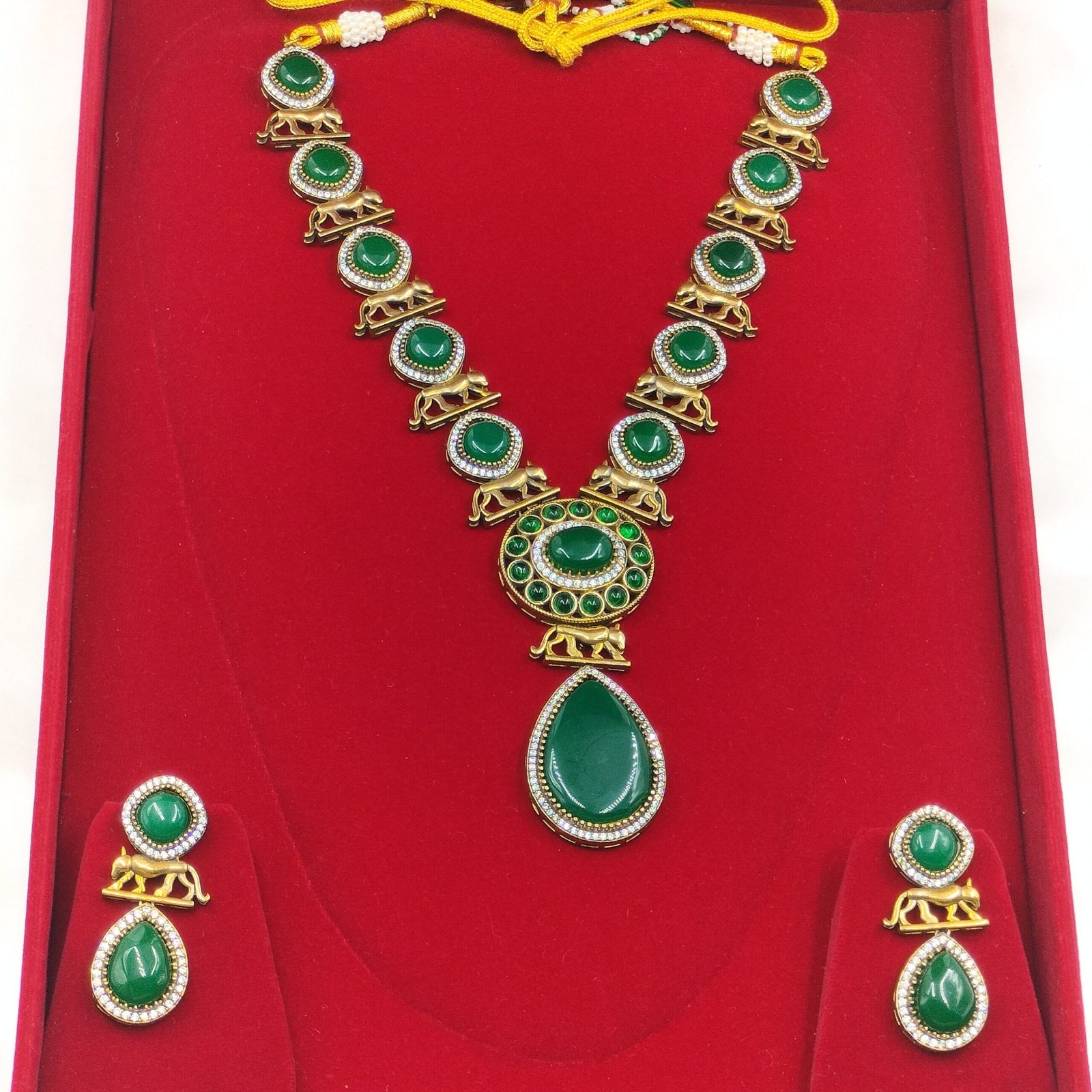 Crafted with lustrous green stones, delicate Kundan-style work, and antique gold plating, this set reflects the essence of classic Indian bridal jewellery. The choker-style necklace sits beautifully around the collarbone, while the complementing earrings complete your festive or bridal look with finesse.