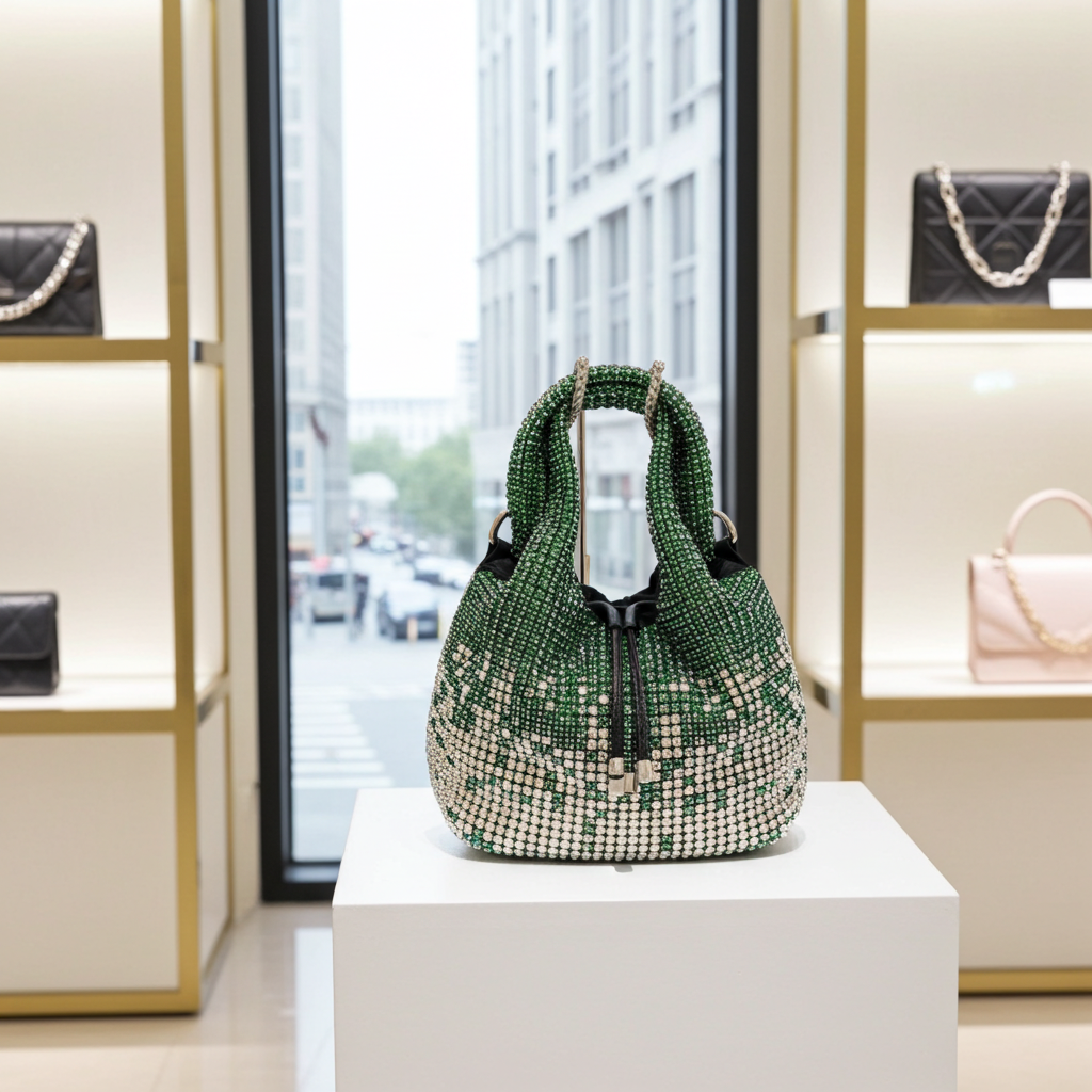 This vibrant handbag features an all-over rhinestone embellishment in lush green tones, meticulously hand-set to create a high-impact, elegant finish. The green shade adds a refreshing contrast to traditional outfits and contemporary evening dresses alike.