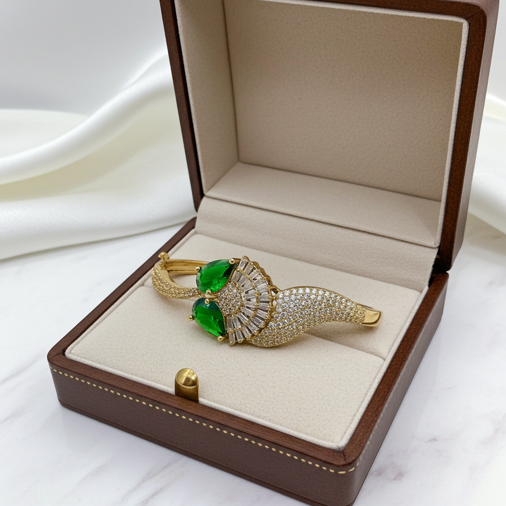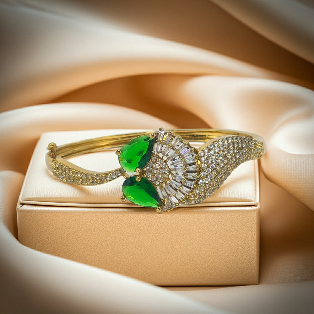 The bracelet features captivating green stones that symbolize freshness and harmony. Each stone is precisely set in a high-quality gold-tone base, creating a striking contrast that draws attention. Its graceful design makes it suitable for ethnic wear, party outfits, or even daily fashion.