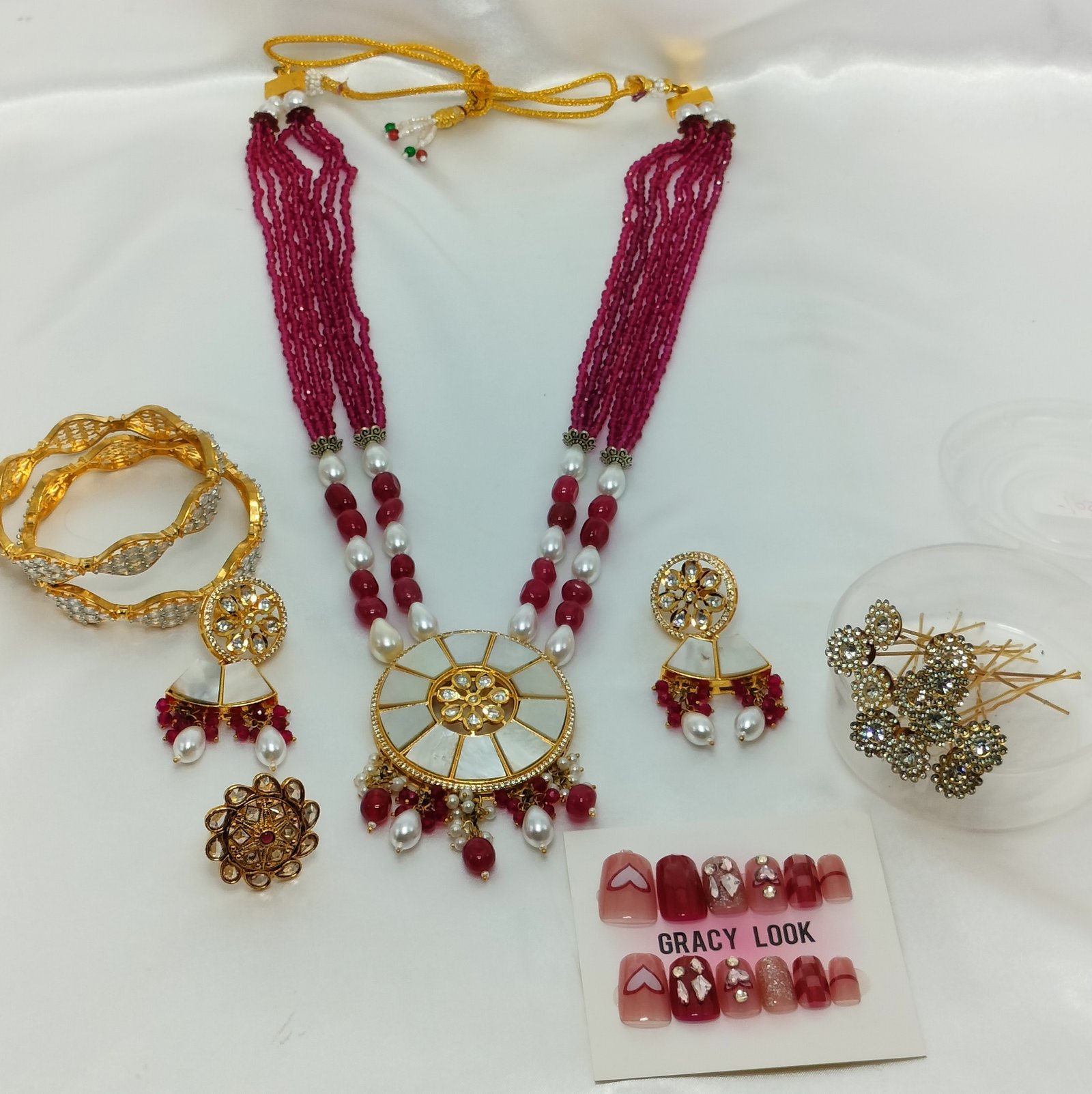 This jewellery combo includes a stunning necklace, matching earrings, a classic maang tikka, and elegant bangles. Together, they create a graceful festive look that pairs effortlessly with sarees, lehengas, and traditional gowns.