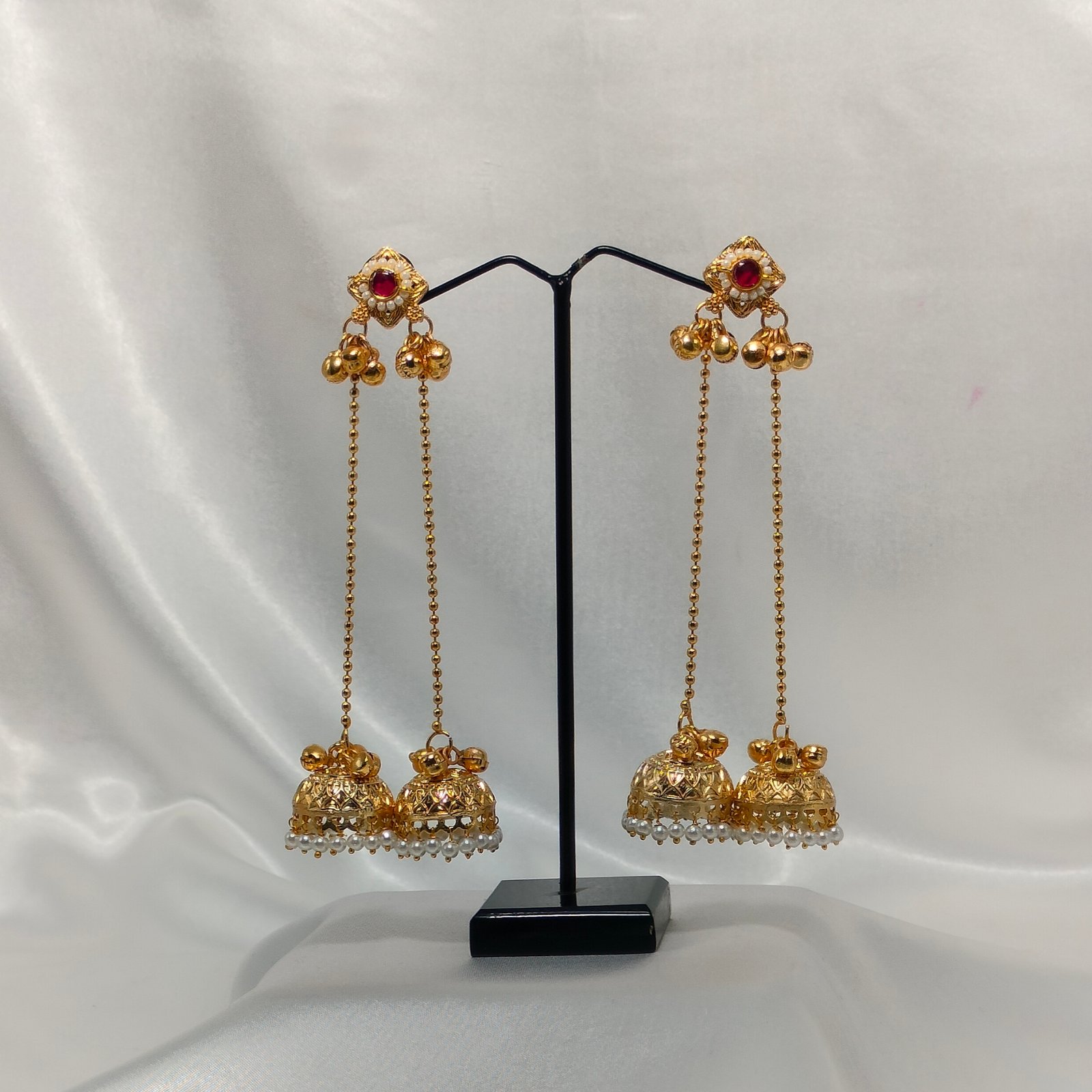 Each jhumka features a red stone stud, symbolizing beauty and grace. The hanging dome design with delicate pearl drops adds a soft shimmer to your look. These earrings are perfect for weddings, cultural events, and family celebrations.