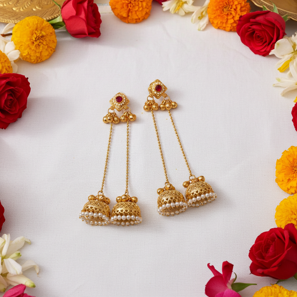 The Kashmiri Jhumka from Radiant Jewels Store captures the true spirit of Indian tradition. These long-chain earrings reflect the intricate beauty of Kashmiri craftsmanship. The gold-tone finish gives them a rich, royal appeal that complements festive and ethnic outfits.