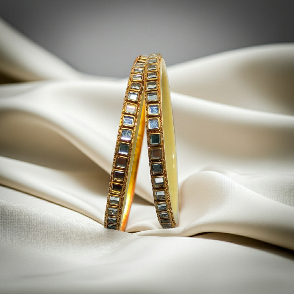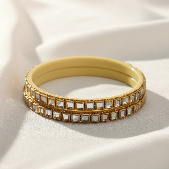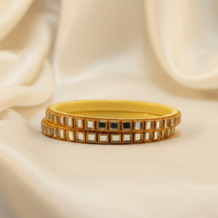 Each bangle is intricately studded with gleaming kundan stones that reflect traditional Indian craftsmanship. Set against a gold-tone base, the stones shine with brilliance, elevating your ethnic ensemble instantly. The ornate details are perfect for brides, wedding guests, or anyone wishing to embrace the grandeur of Indian festivals with confidence and style.