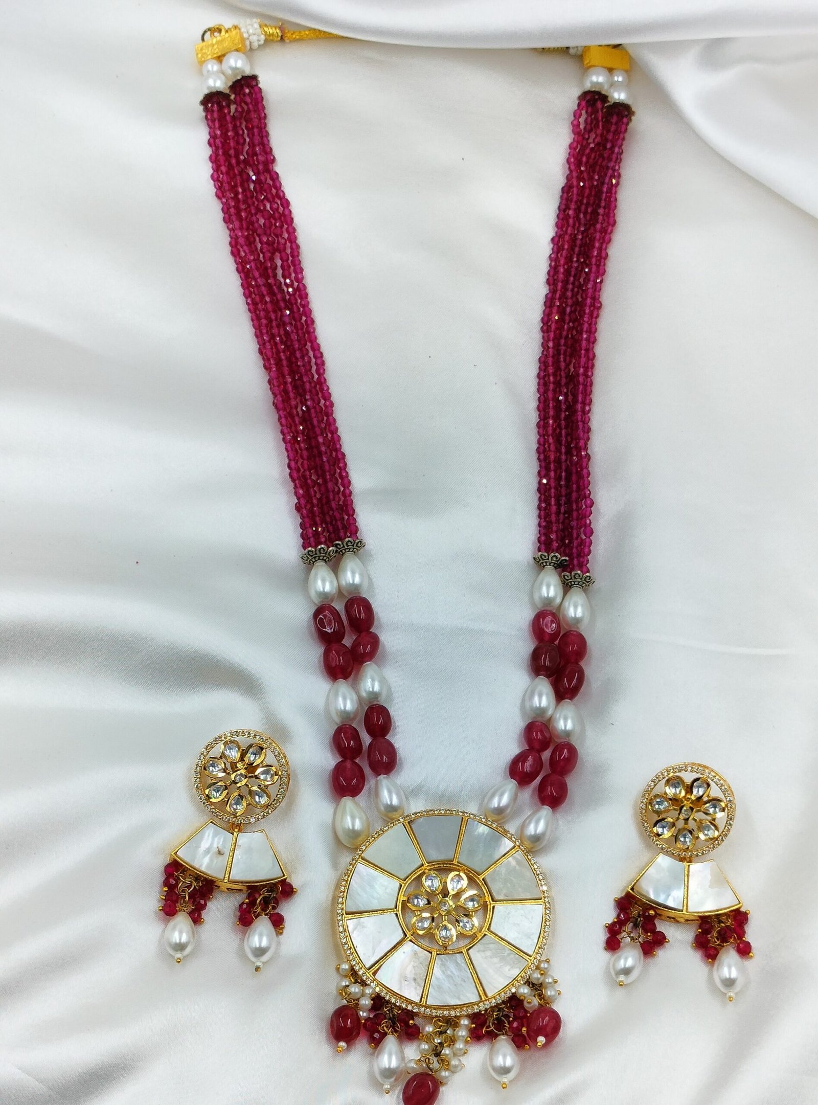 Kundan Jewellery Set is the spotlight of our Kundan and Pearl Jewellery Set, a breathtaking blend of timeless elegance and festive charm. This exclusive design highlights a layered red bead necklace, delicately accented with luminous white pearls and rich ruby-toned stones. At the center lies a beautifully crafted round kundan pendant, gracefully adorned with a lustrous mother-of-pearl inlay.