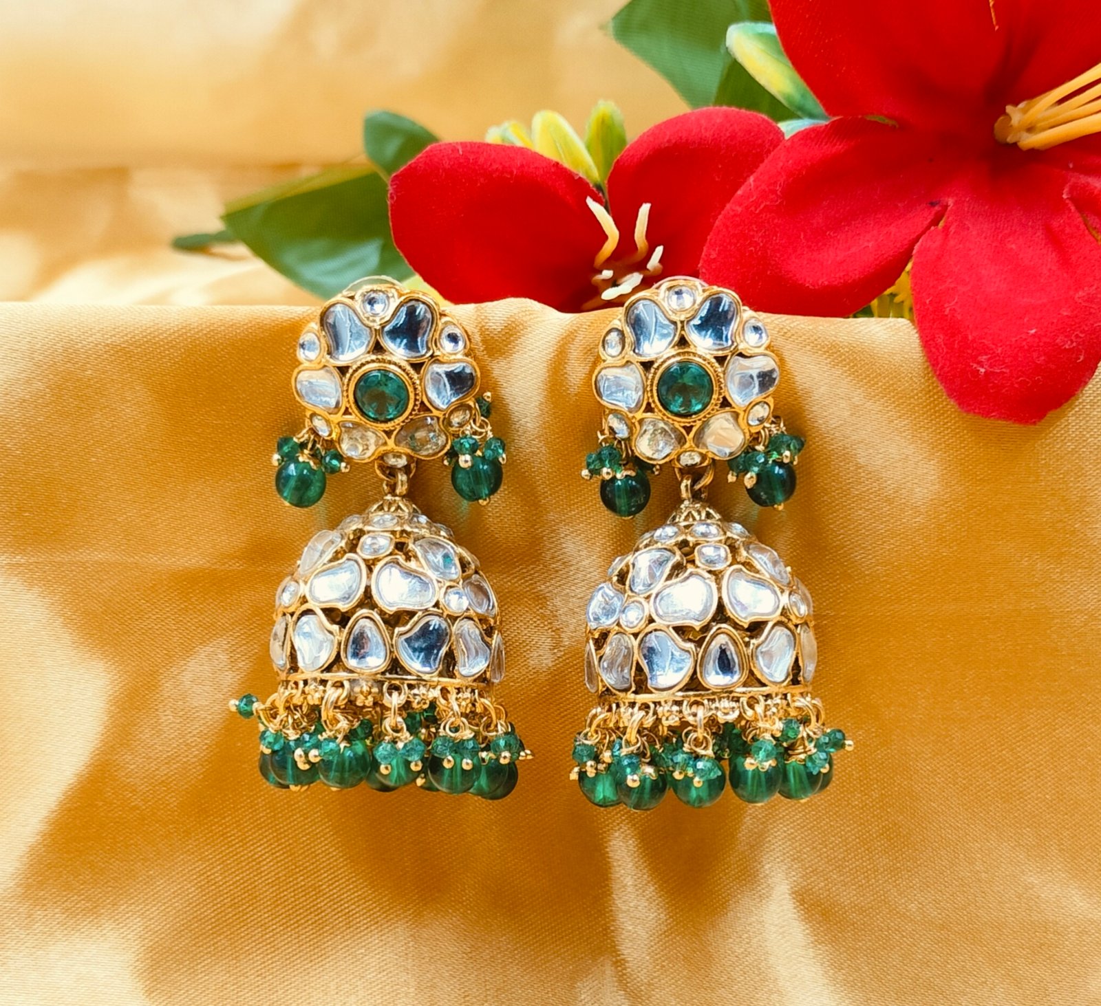 💚 Kundan Jhumka with Green Pearls – Timeless Elegance for Every Celebration