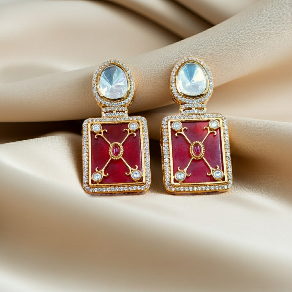 Each piece features a stunning maroon enamel base, delicately embedded with shimmering kundan stones. The deep red hue exudes passion and celebration, while the intricate kundan detailing adds royal charm. These earrings aren’t just accessories—they’re wearable art that brings out the festive sparkle in your style.