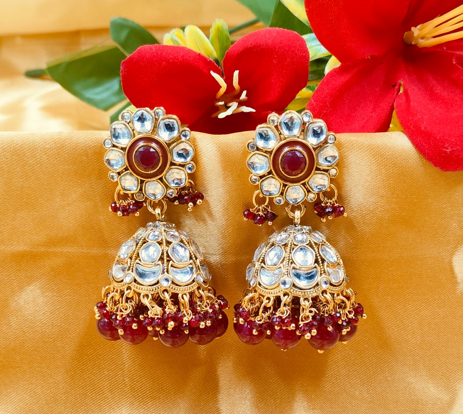 Whether you’re dressing for Diwali, Karva Chauth, Rakhi, or a grand wedding, the Maroon Kundan Jhumki Earrings promise to make you feel royal.