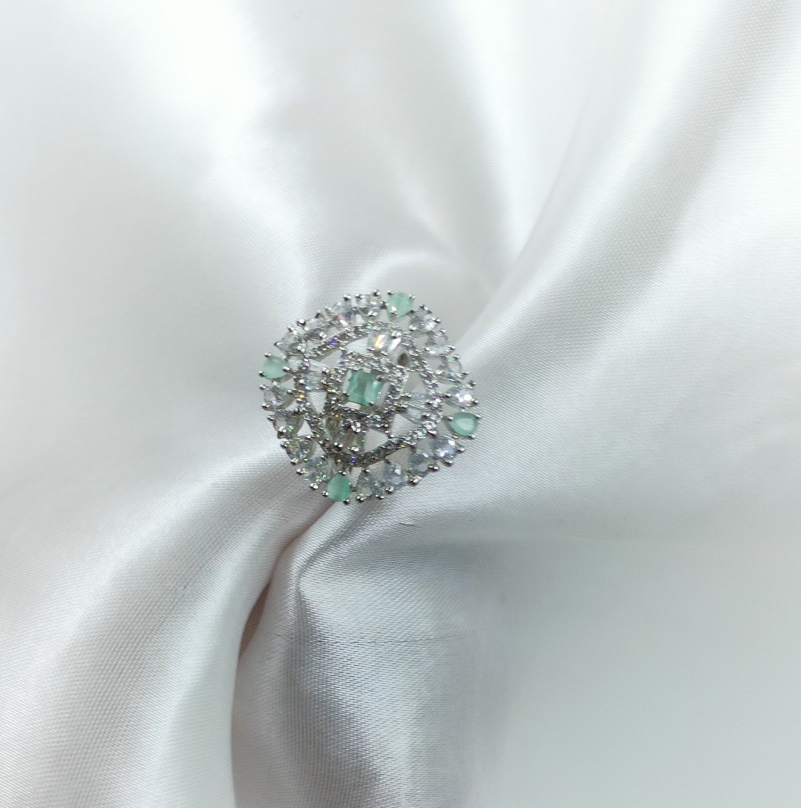 Crafted with care, the ring features a carefully cut Cubic Zirconia (CZ) stone in a refreshing mint green shade. The color immediately draws attention while remaining soft and versatile enough to pair with Indian and Western attire alike. The geometric design adds a modern twist to its otherwise classic aesthetic, making it an easy-to-wear accessory for both daily wear and celebratory moments.