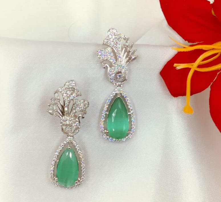Each earring features a drop-shaped mint green cubic zirconia stone, delicately set in a silver-toned frame that enhances the brilliance of the stone. The design flows with grace and brings a sense of calm elegance to ethnic as well as fusion wear. Whether you’re dressing up for a wedding, a festive celebration, or a casual brunch with friends, these earrings are sure to make a delightful statement.
