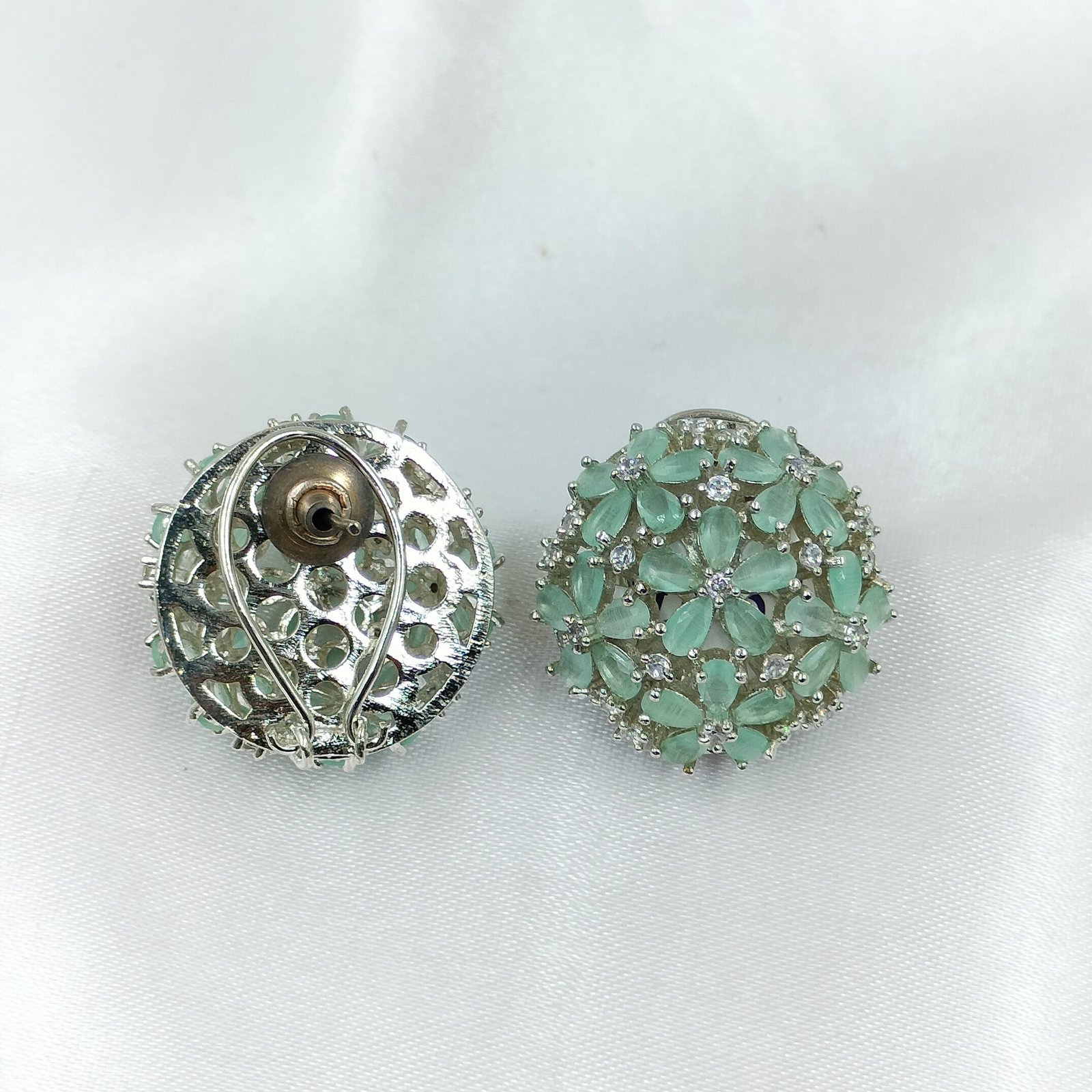 Each stud features a delicate floral motif crafted with mint green cubic zirconia petals. At the center, a brilliant CZ stone adds just the right amount of sparkle. The mint green color pairs beautifully with pastel sarees, summer dresses, and even casual cotton kurtis. Whether you’re heading to a brunch, attending a wedding, or gifting someone special, these studs are the perfect finishing touch.