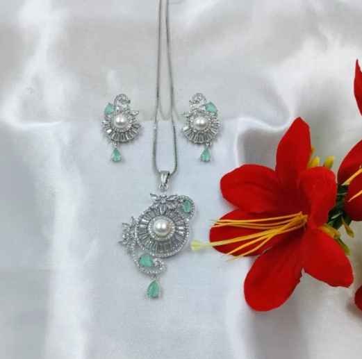 This pastel-toned pendant set is a refreshing break from bold hues. The delicate mint green pearls beautifully complement the subtle shimmer of finely cut crystals. Together, they create a graceful harmony that reflects light and radiates poise.
