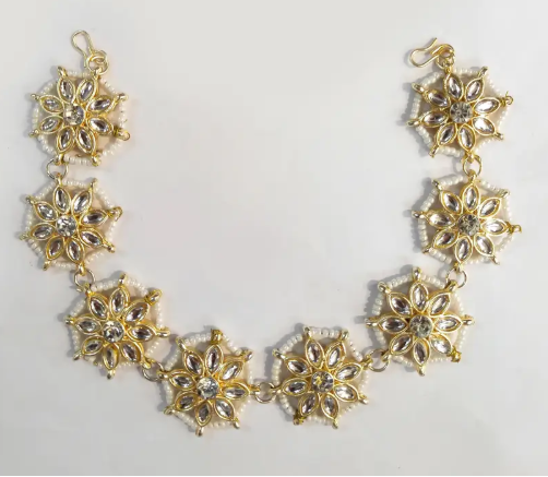 Skilled artisans craft each Moti and Stone Matha Patti, using traditional techniques passed down through generations. The design blends classic and contemporary styles, so you can wear it on many occasions. The secure fitting mechanism keeps this beautiful adornment in place all day, letting you wear it confidently from morning to night.