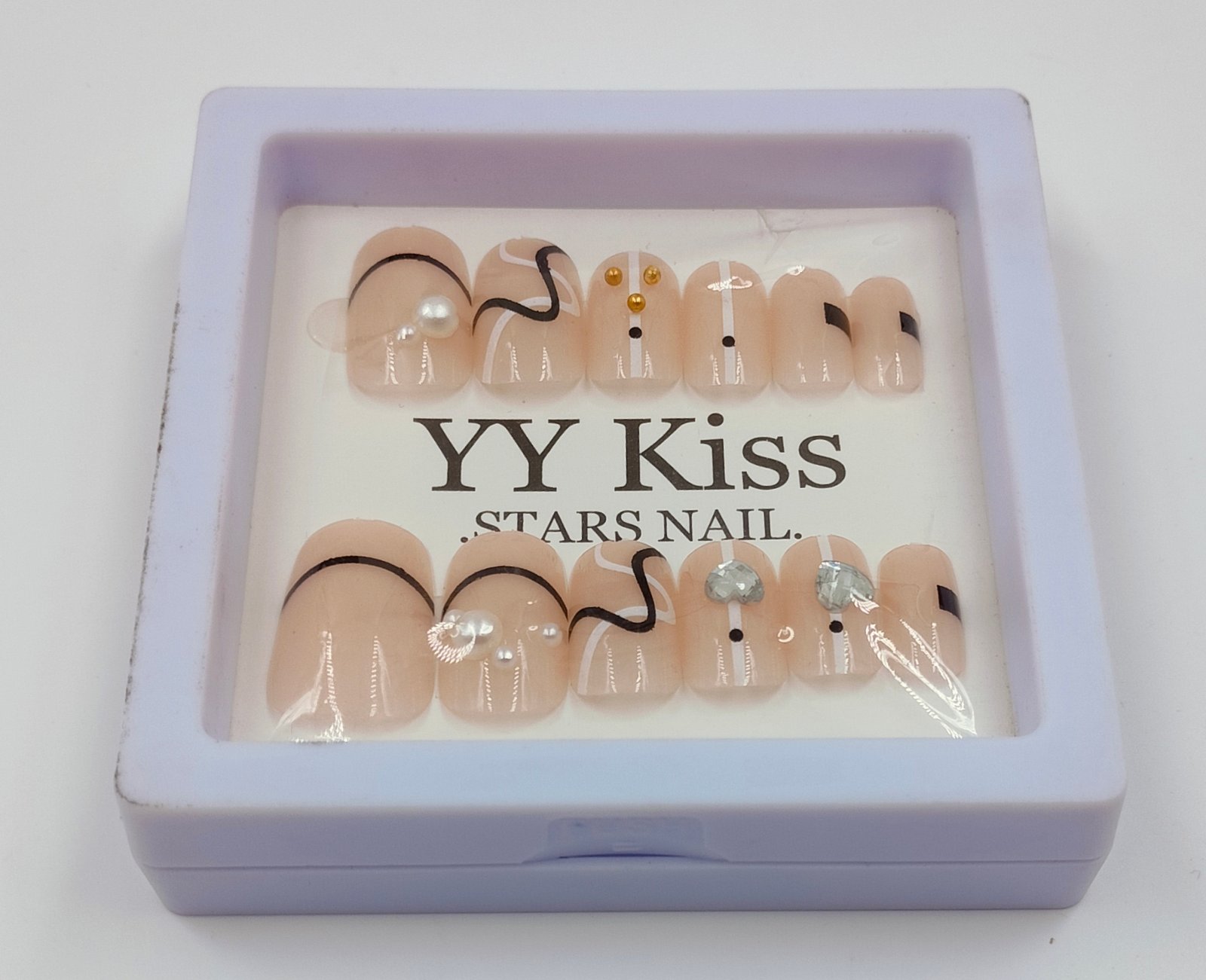 The Nude & Black Abstract Press-Ons from Radiant Jewels bring instant style to your fingertips. With a soft nude base and bold black abstract patterns, these nails strike the perfect balance between elegance and edge. They are ideal for brunch dates, parties, and everyday wear.