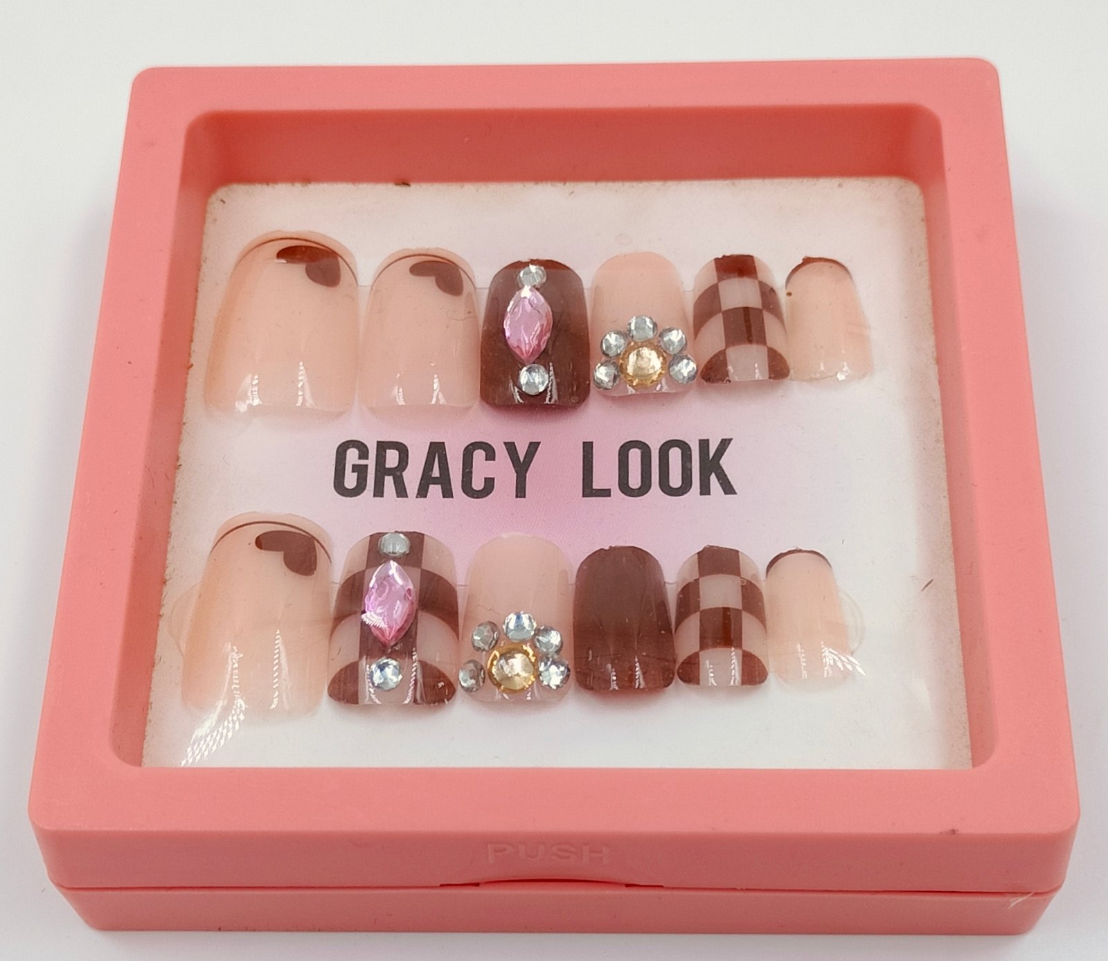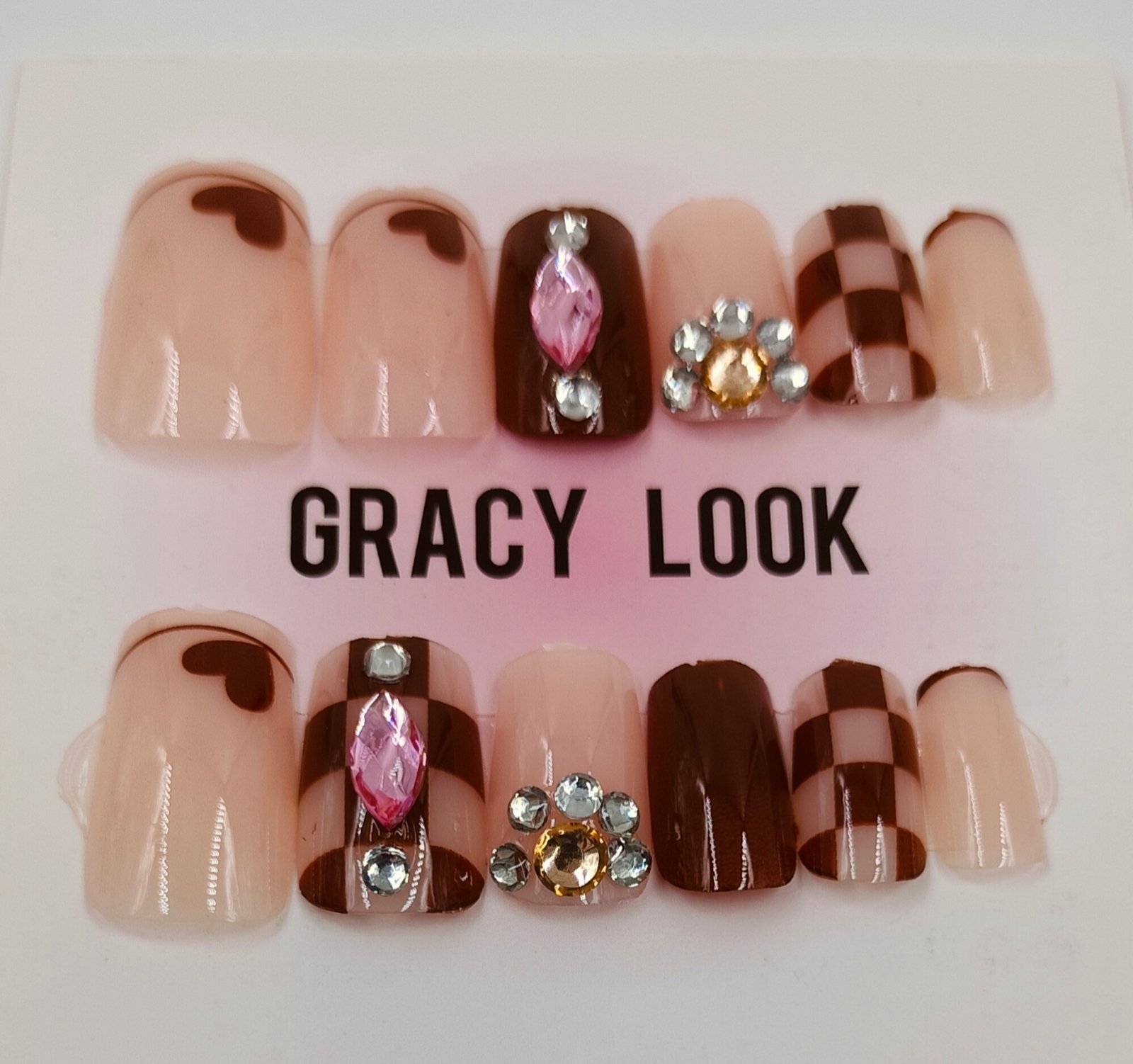 Upgrade your style with Nude-Maroon Press-On Nails from www.radiantjewels.store. This premium artificial nail extension set blends glossy nude tones with bold maroon accents, finished with 3D rhinestones, pink gems, gold stones, and chic checkered nail art. Perfect for anyone who loves salon-quality press-on nails without the hassle or high cost of appointments.
