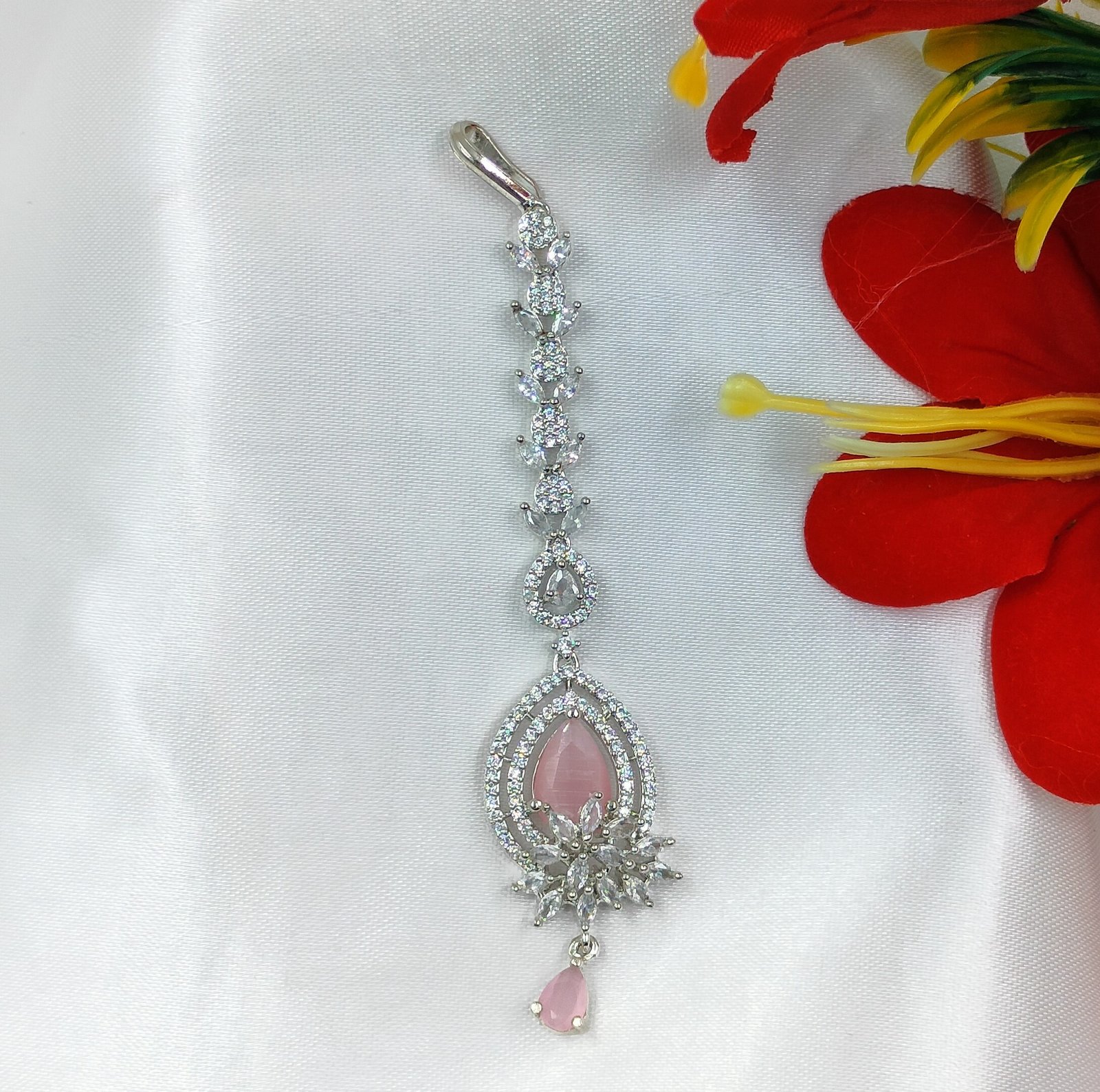 Step into the spotlight with our Pink AD teardrop Maang Tikka, a timeless piece that beautifully blends tradition with modern charm. The soft blush teardrop centerpiece is surrounded by sparkling American Diamonds. Each stone is carefully set to reflect light with every movement, adding grace to your look.