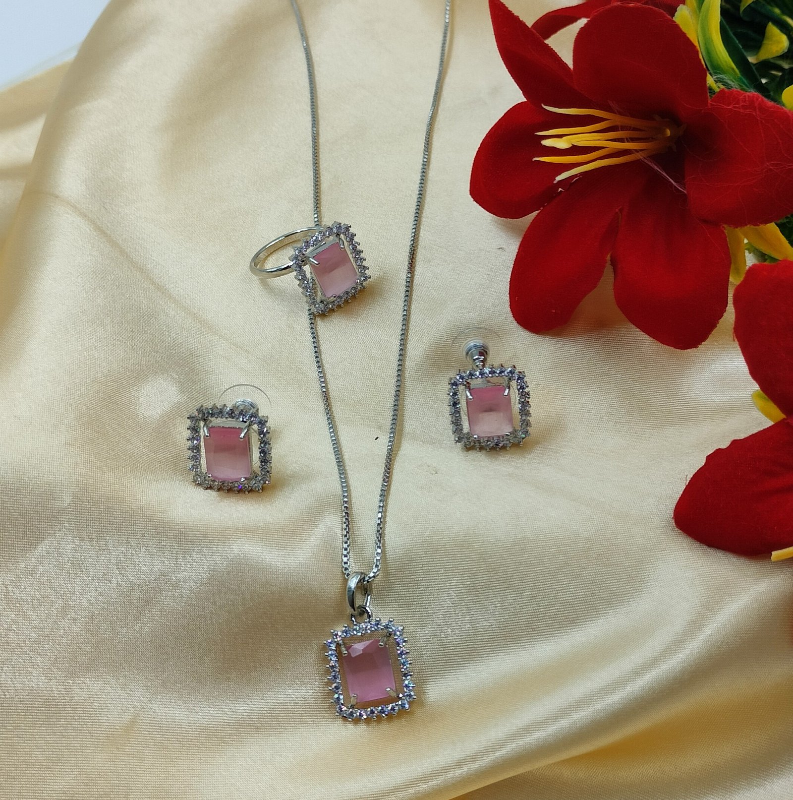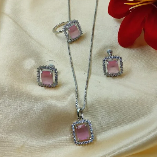 The pendant features a soft pink crystal placed delicately on a silver-toned base. Matching earrings mirror the same design, making the entire set cohesive and elegant. Its lightweight nature ensures all-day comfort, while the adjustable chain fits beautifully on any neckline.
